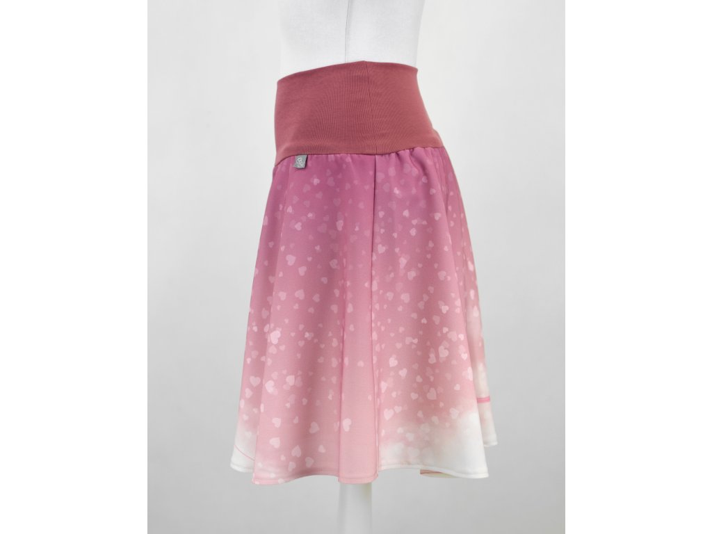 Dámská sukně půlkolového střihu s dvojitým elastickým pasovým okrajem vhodným pro většinu velikostí. Podšité polyesterovou látkou, která je vhodná jak na punčochy, tak na holé nohy a sukně se dá nosit celoročně. Z rubu elastického pasu je nechán otvor na případné vložení gumy na zpevnění či stažení pasu.