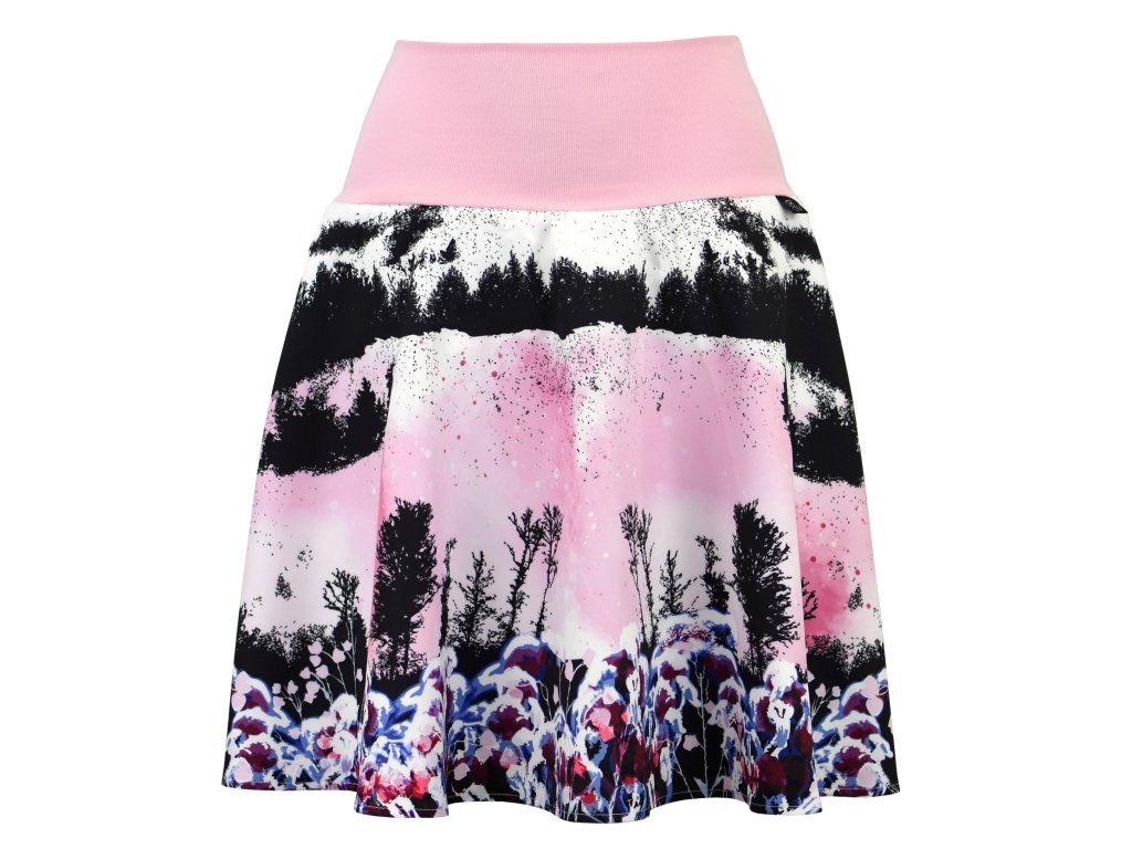 Dámská sukně půlkolového střihu s dvojitým elastickým pasovým okrajem vhodným pro většinu velikostí. Podšité polyesterovou látkou, která je vhodná jak na punčochy, tak na holé nohy a sukně se dá nosit celoročně. Z rubu elastického pasu je nechán otvor na případné vložení gumy na zpevnění či stažení pasu.