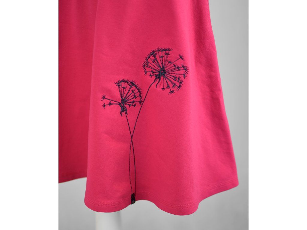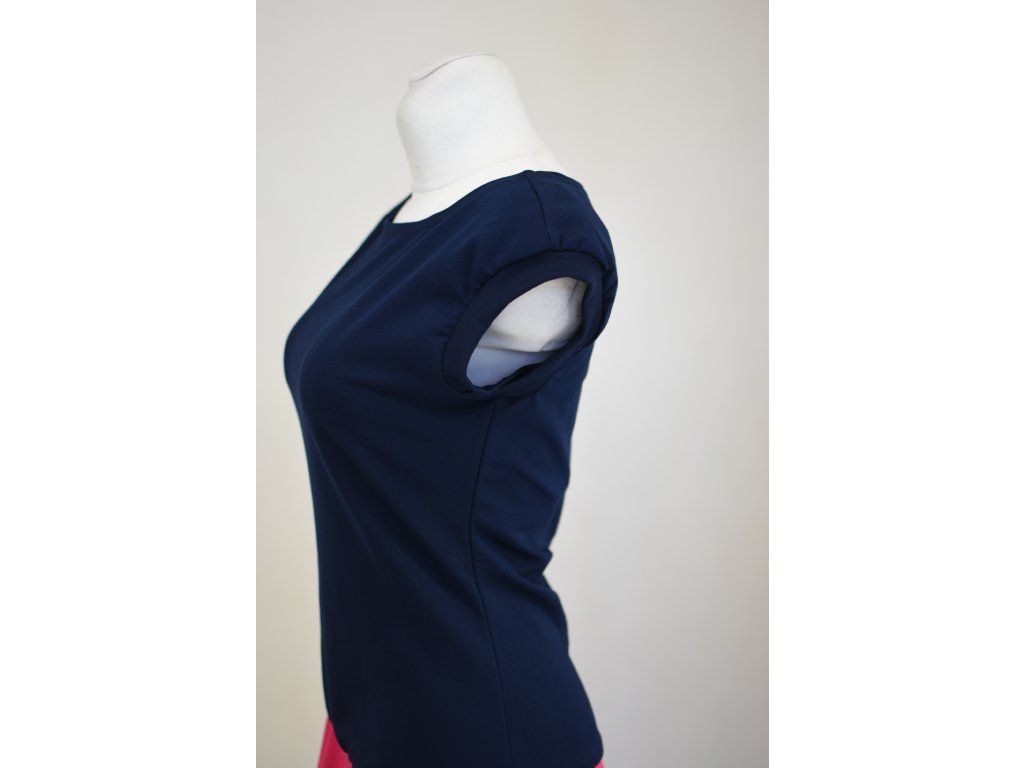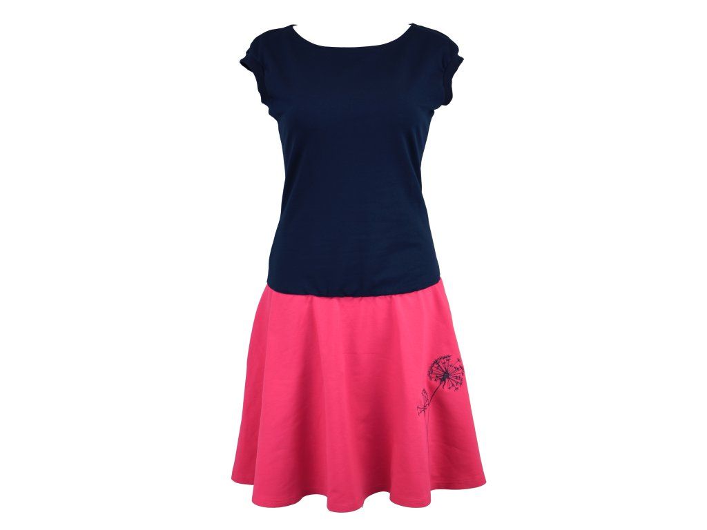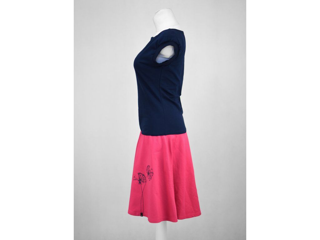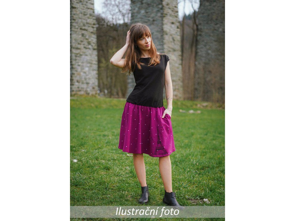 Dámská šatovka přestřižená v bocích. Díky všité gumičce se dá šatovka podkasat. Sukně je půlkolová, se skrytými kapsami v bocích, bez podšívky. Průramky lemované úpletem.