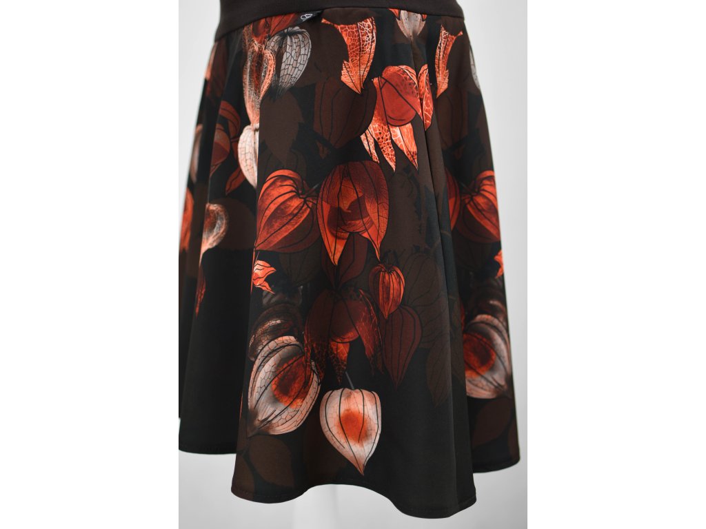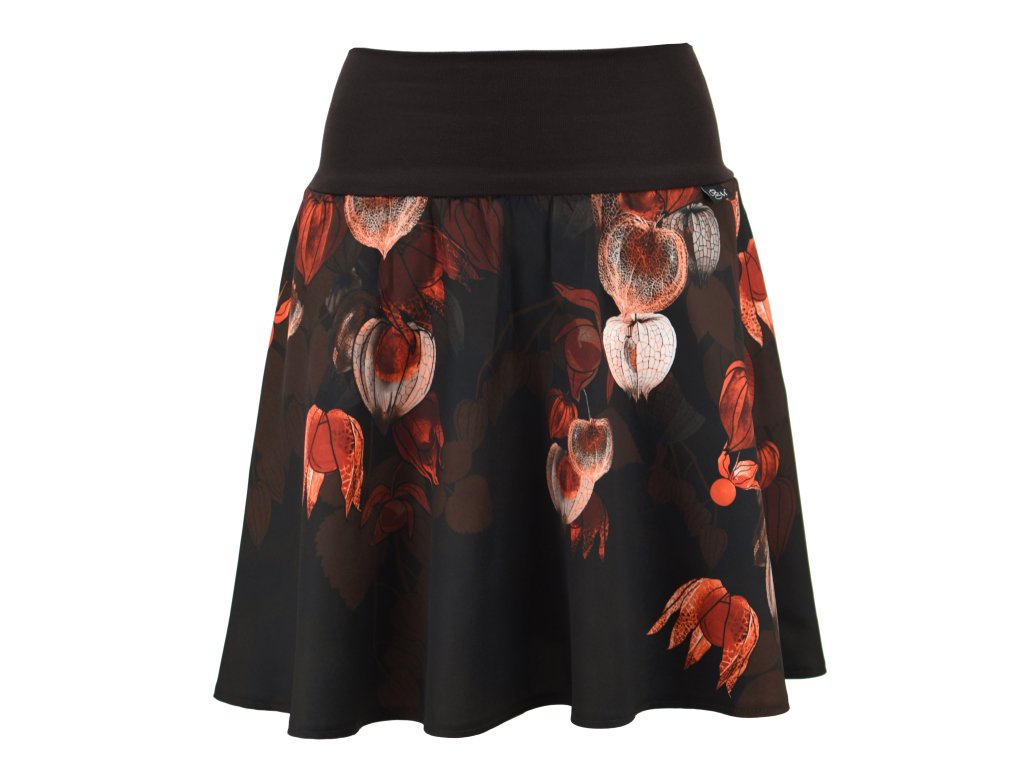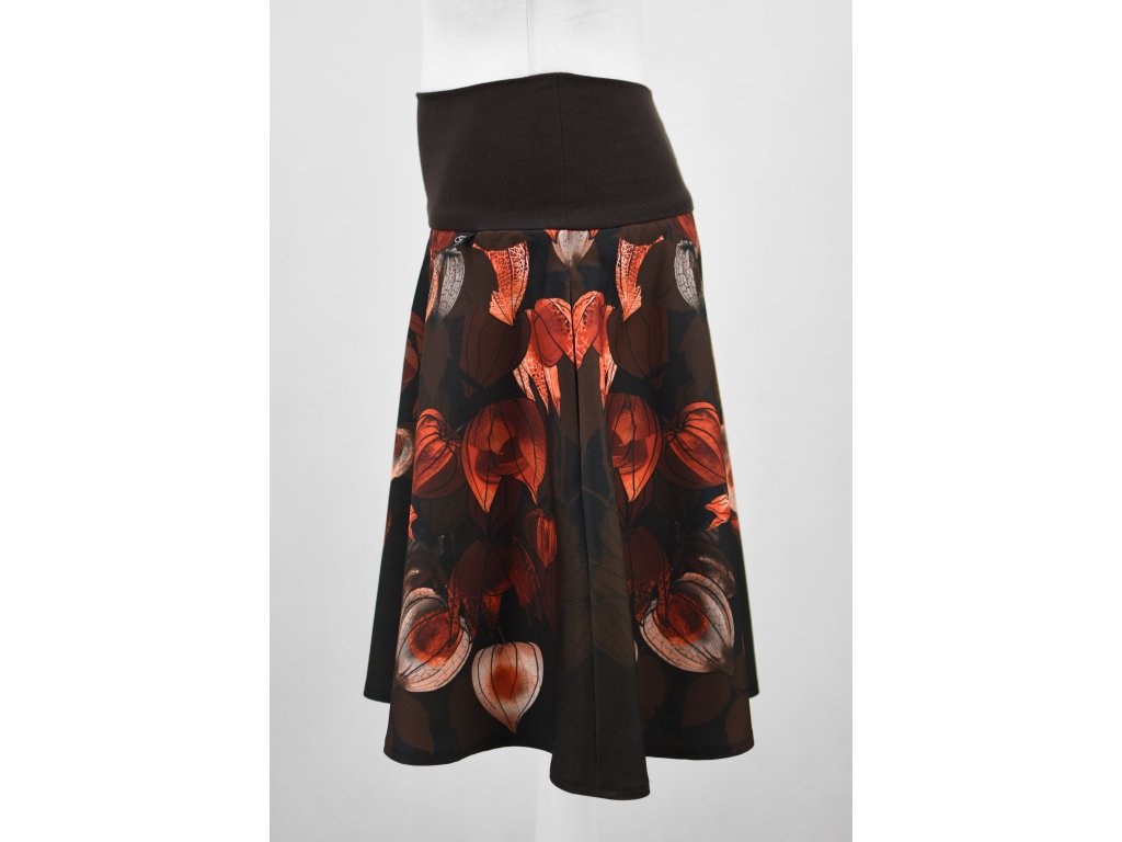 Dámská sukně půlkolového střihu s dvojitým elastickým pasovým okrajem vhodným pro většinu velikostí. Podšité polyesterovou látkou, která je vhodná jak na punčochy, tak na holé nohy a sukně se dá nosit celoročně. Z rubu elastického pasu je nechán otvor na případné vložení gumy na zpevnění či stažení pasu.