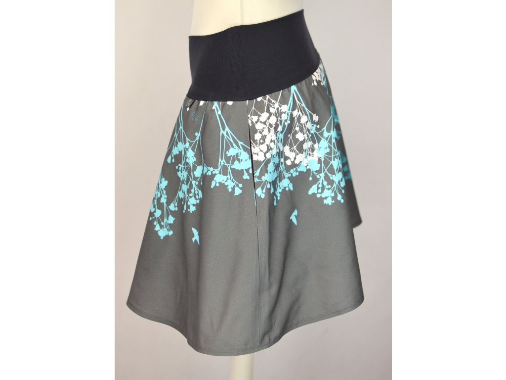 Dámská sukně půlkolového střihu s dvojitým elastickým pasovým okrajem vhodným pro většinu velikostí. Podšité polyesterovou látkou, která je vhodná jak na punčochy, tak na holé nohy a sukně se dá nosit celoročně. Z rubu elastického pasu je nechán otvor na případné vložení gumy na zpevnění či stažení pasu (vhodné pro velikost XS).