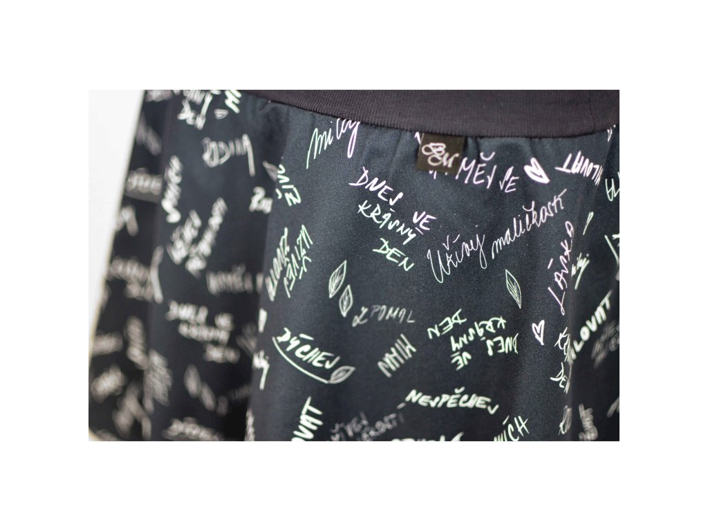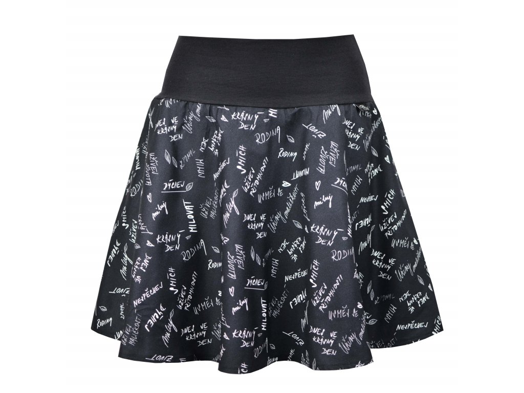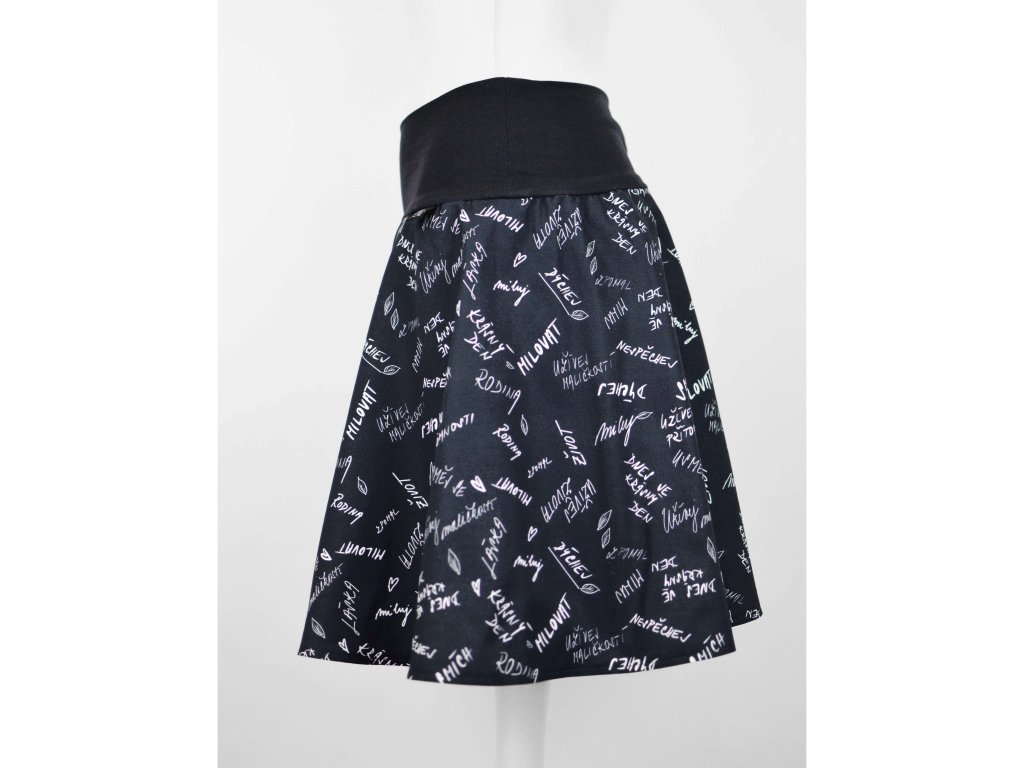 Dámská sukně půlkolového střihu s dvojitým elastickým pasovým okrajem vhodným pro většinu velikostí. Podšité polyesterovou látkou, která je vhodná jak na punčochy, tak na holé nohy a sukně se dá nosit celoročně. Z rubu elastického pasu je nechán otvor na případné vložení gumy na zpevnění či stažení pasu (vhodné pro velikost XS).