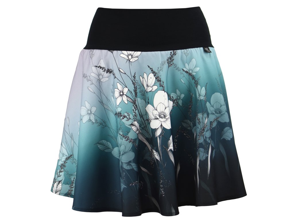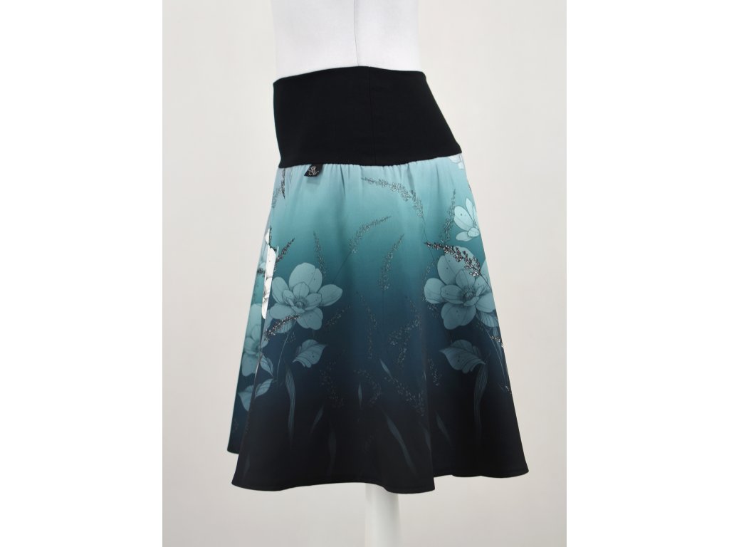 Dámská sukně půlkolového střihu s dvojitým elastickým pasovým okrajem vhodným pro většinu velikostí. Podšité polyesterovou látkou, která je vhodná jak na punčochy, tak na holé nohy a sukně se dá nosit celoročně. Z rubu elastického pasu je nechán otvor na případné vložení gumy na zpevnění či stažení pasu.
