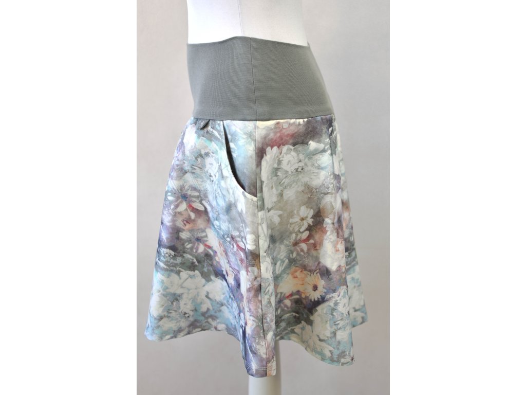 Dámská sukně půlkolového střihu s dvojitým elastickým pasovým okrajem vhodným pro většinu velikostí. Kapsy v bocích jsou olemovány úpletem. Z rubu elastického pasu je nechán otvor na případné vložení gumy na zpevnění či stažení pasu (vhodné pro velikost XS).