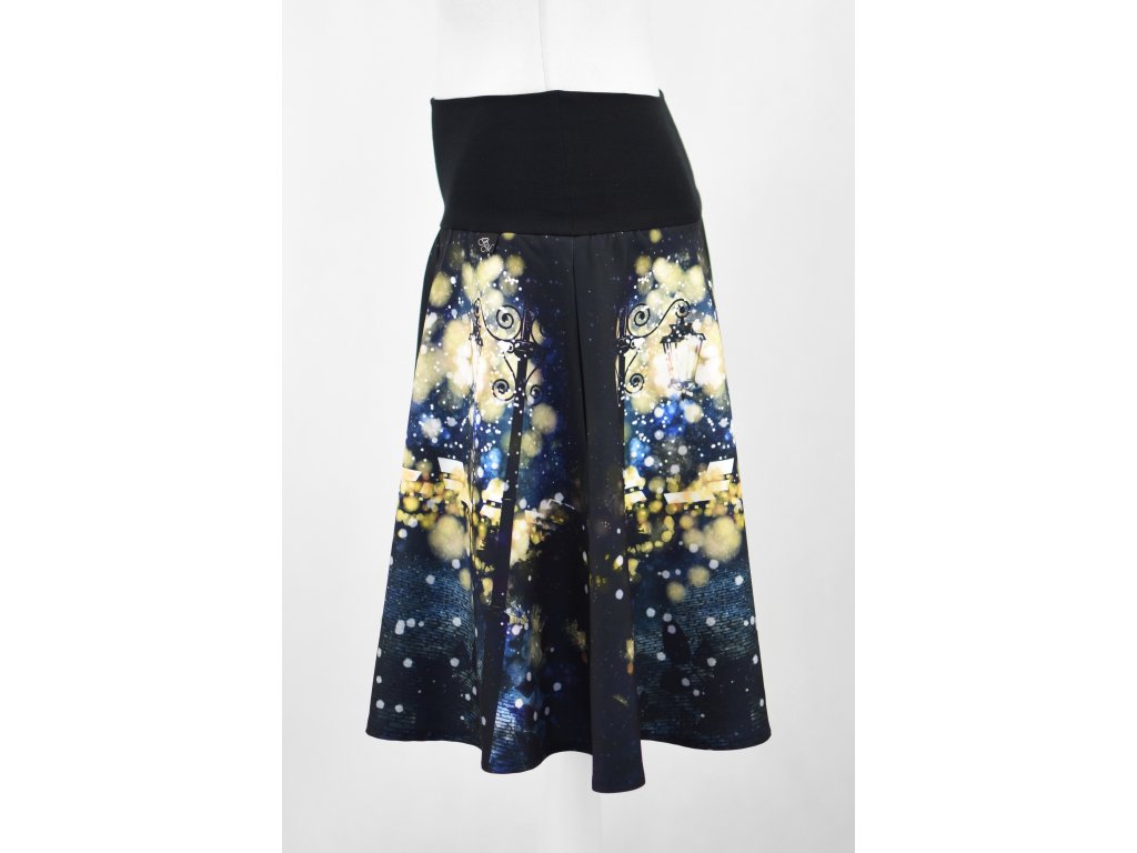 Dámská sukně půlkolového střihu s dvojitým elastickým pasovým okrajem vhodným pro většinu velikostí. Podšité polyesterovou látkou, která je vhodná jak na punčochy, tak na holé nohy a sukně se dá nosit celoročně. Z rubu elastického pasu je nechán otvor na případné vložení gumy na zpevnění či stažení pasu.