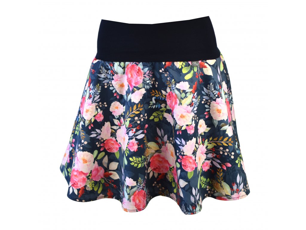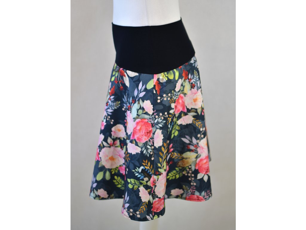 Dámská sukně půlkolového střihu s dvojitým elastickým pasovým okrajem vhodným pro většinu velikostí. Z rubu elastického pasu je nechán otvor na případné vložení gumy na zpevnění či stažení pasu (vhodné pro velikost XS).