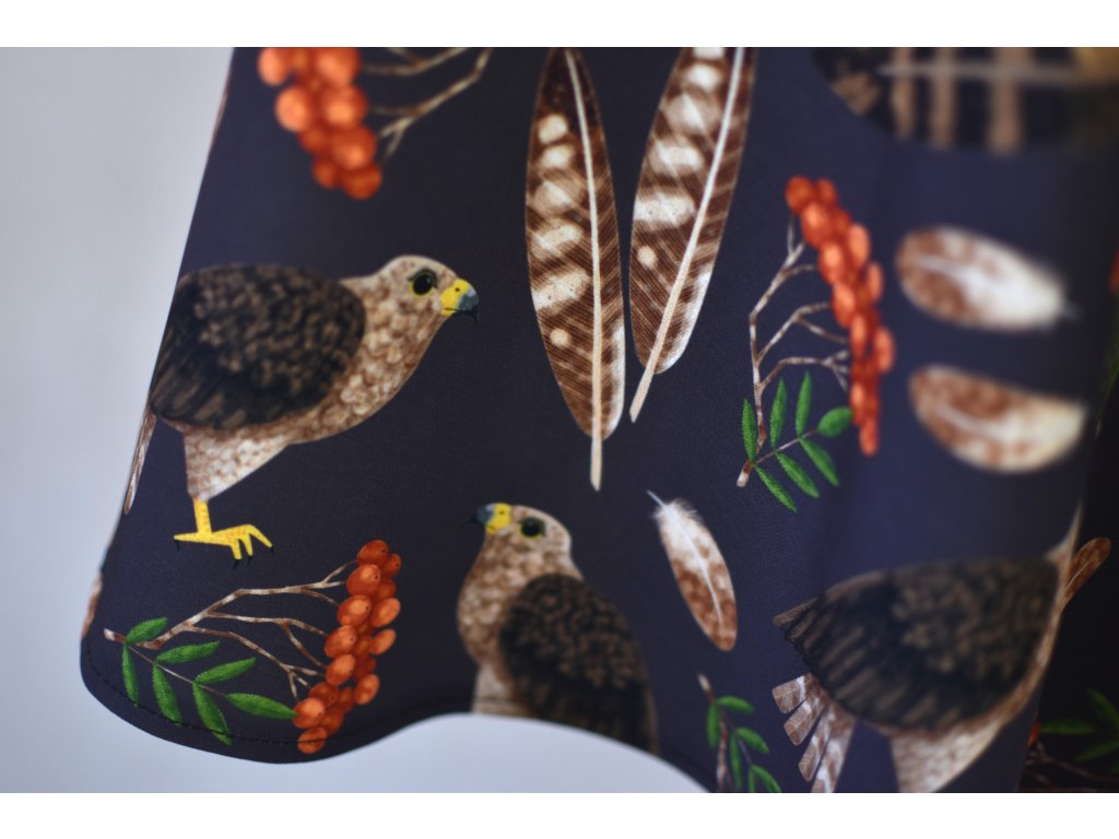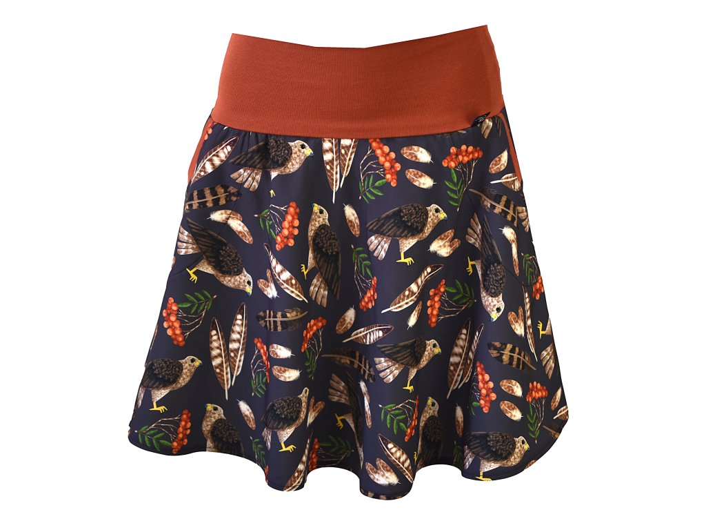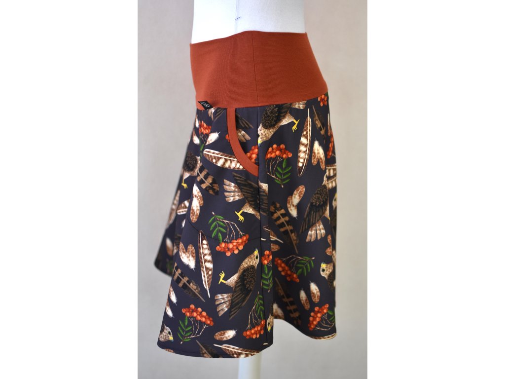 Dámská sukně půlkolového střihu s dvojitým elastickým pasovým okrajem vhodným pro většinu velikostí. Z rubu elastického pasu je nechán otvor na případné vložení gumy na zpevnění či stažení pasu (vhodné pro velikost XS).