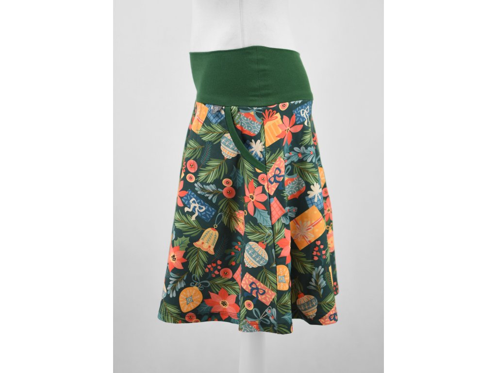 Dámská sukně půlkolového střihu s dvojitým elastickým pasovým okrajem vhodným pro většinu velikostí. Z rubu elastického pasu je nechán otvor na případné vložení gumy na zpevnění či stažení pasu.