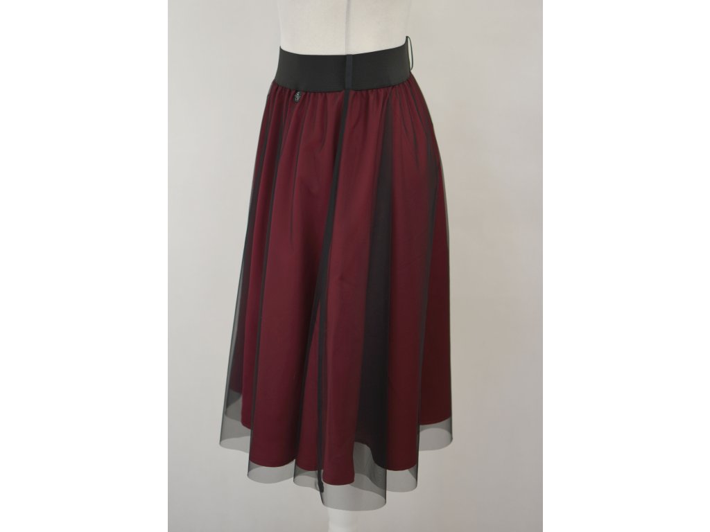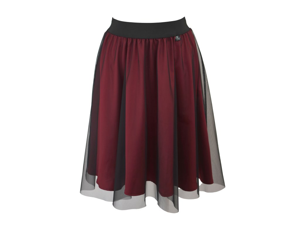 Dámská sukně s elastickou gumou do pasu, půlkolového střihu, s tylem. Sukně nemá podšívku. Délka je měřena bez tylu - tyl přesahuje cca o 5 cm přes sukni. Barva tylu je černá, látka sukně vínová.