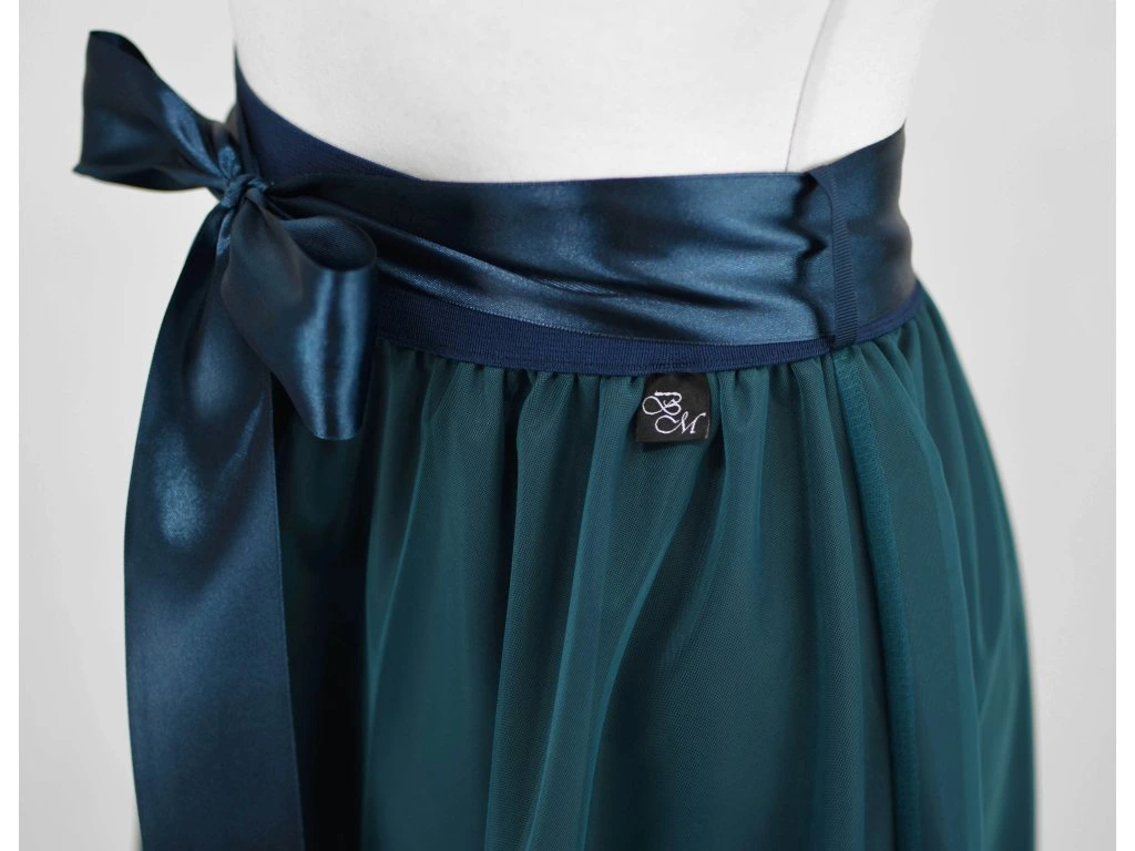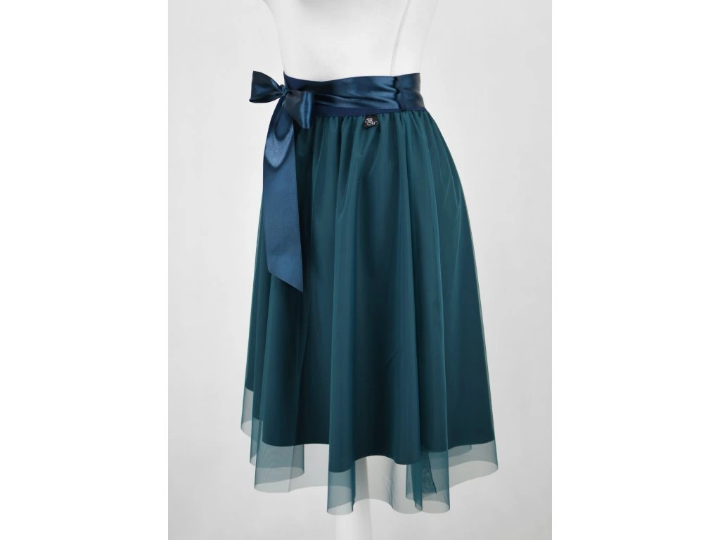 Dámská sukně s elastickou gumou do pasu, půlkolového střihu, s tylem. Sukně nemá podšívku. Délka je měřena bez tylu - tyl přesahuje cca o 5 cm přes sukni. Barva tylu je smaragdově zelená, látka tmavě modrá.