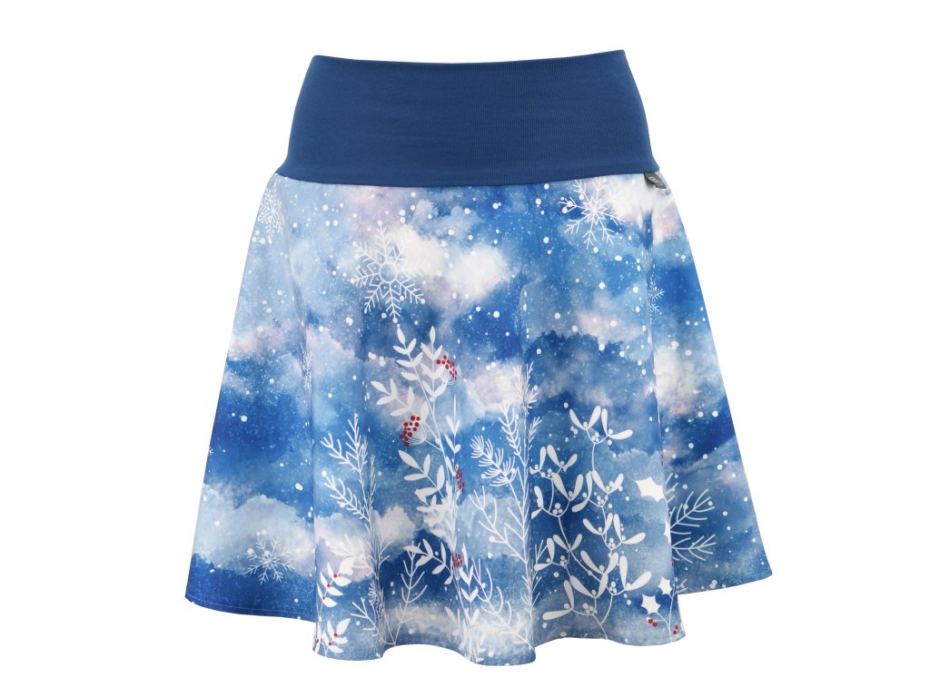 Dámská sukně půlkolového střihu s dvojitým elastickým pasovým okrajem vhodným pro většinu velikostí. Podšité polyesterovou látkou, která je vhodná jak na punčochy, tak na holé nohy a sukně se dá nosit celoročně. Z rubu elastického pasu je nechán otvor na případné vložení gumy na zpevnění či stažení pasu.