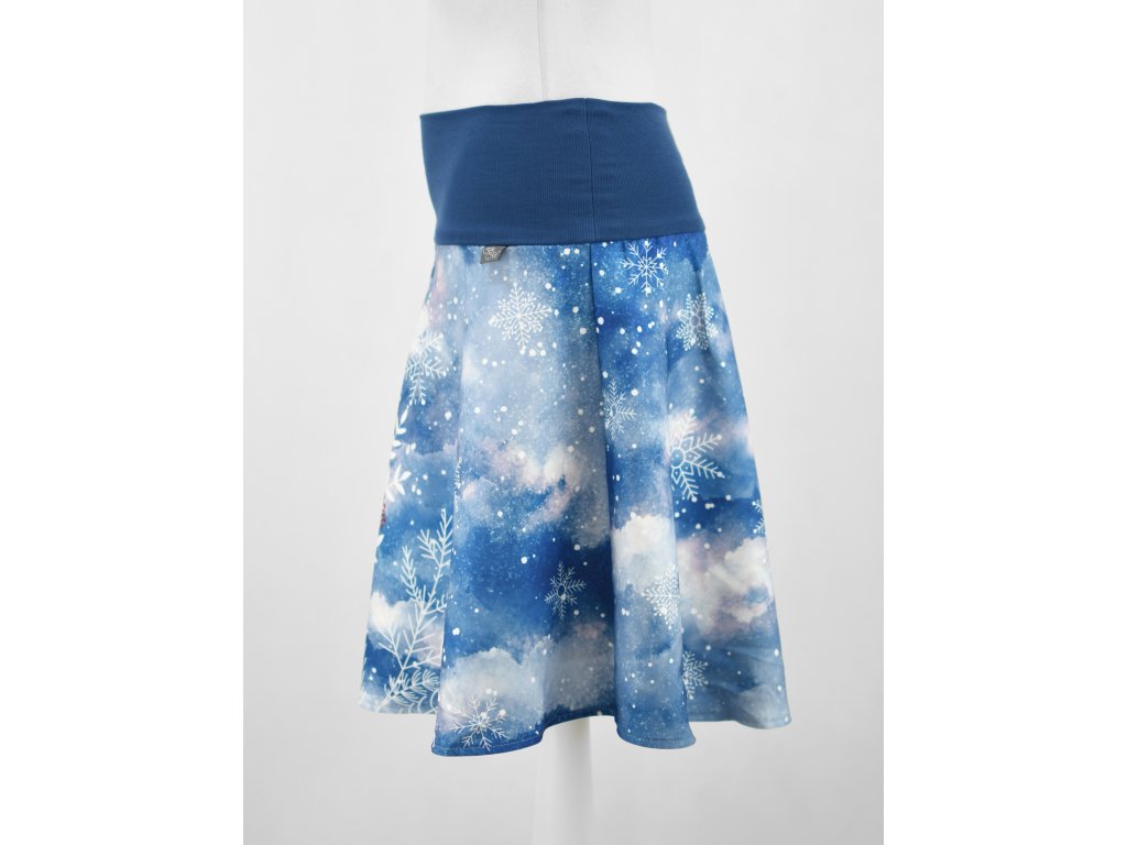 Dámská sukně půlkolového střihu s dvojitým elastickým pasovým okrajem vhodným pro většinu velikostí. Podšité polyesterovou látkou, která je vhodná jak na punčochy, tak na holé nohy a sukně se dá nosit celoročně. Z rubu elastického pasu je nechán otvor na případné vložení gumy na zpevnění či stažení pasu.