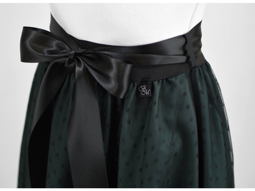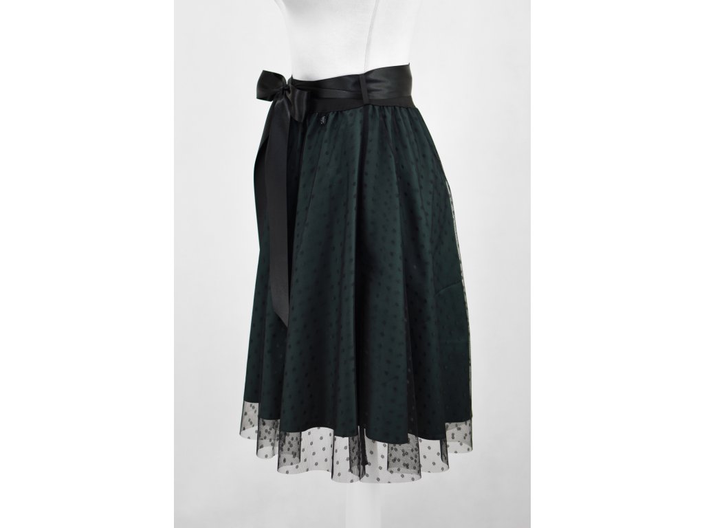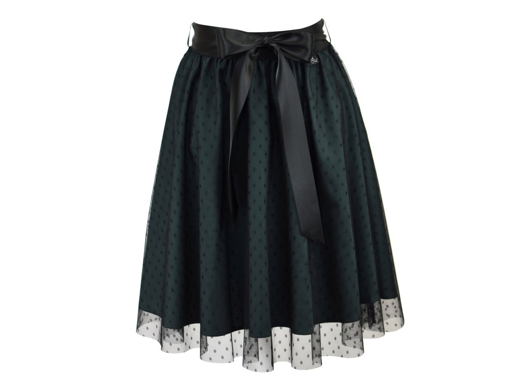 Dámská sukně s elastickou gumou do pasu, půlkolového střihu, s tylem. Sukně nemá podšívku. Délka je měřena bez tylu - tyl přesahuje cca o 5 cm přes sukni. Barva tylu je černá s puntíky, látka sukně zelená.