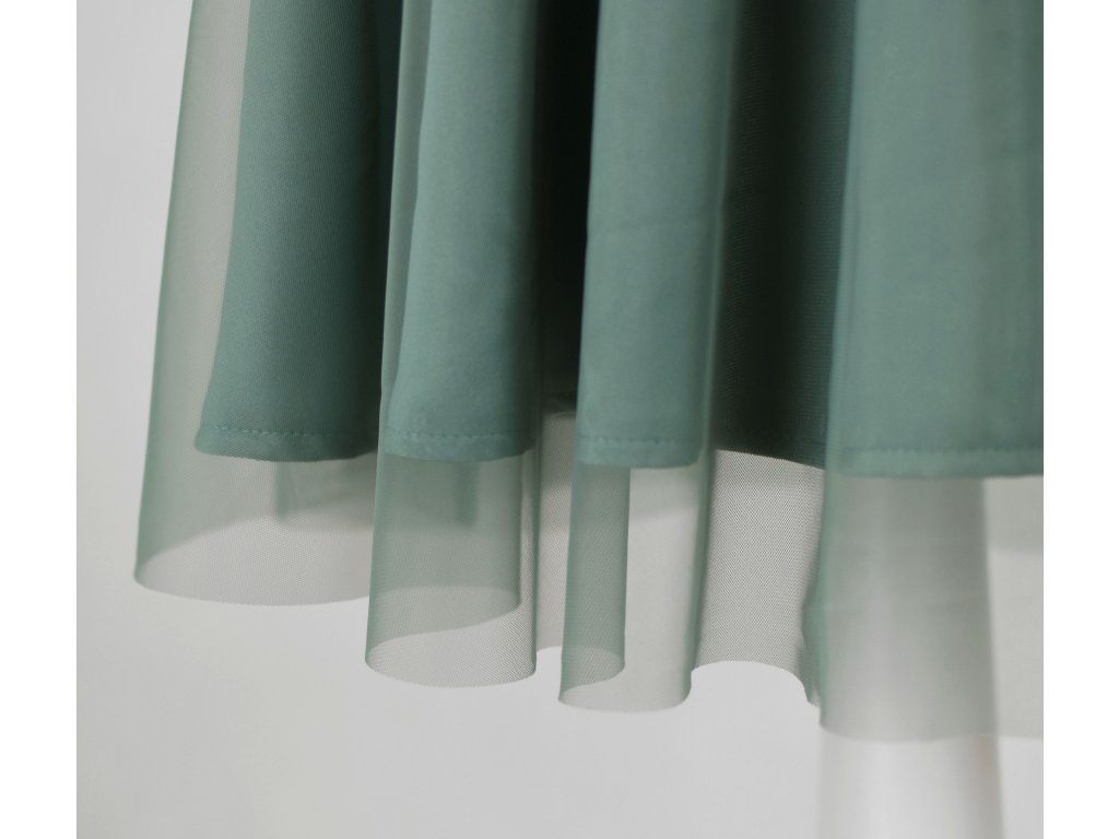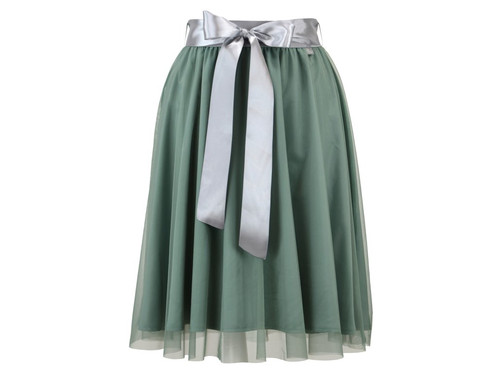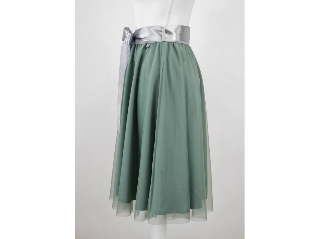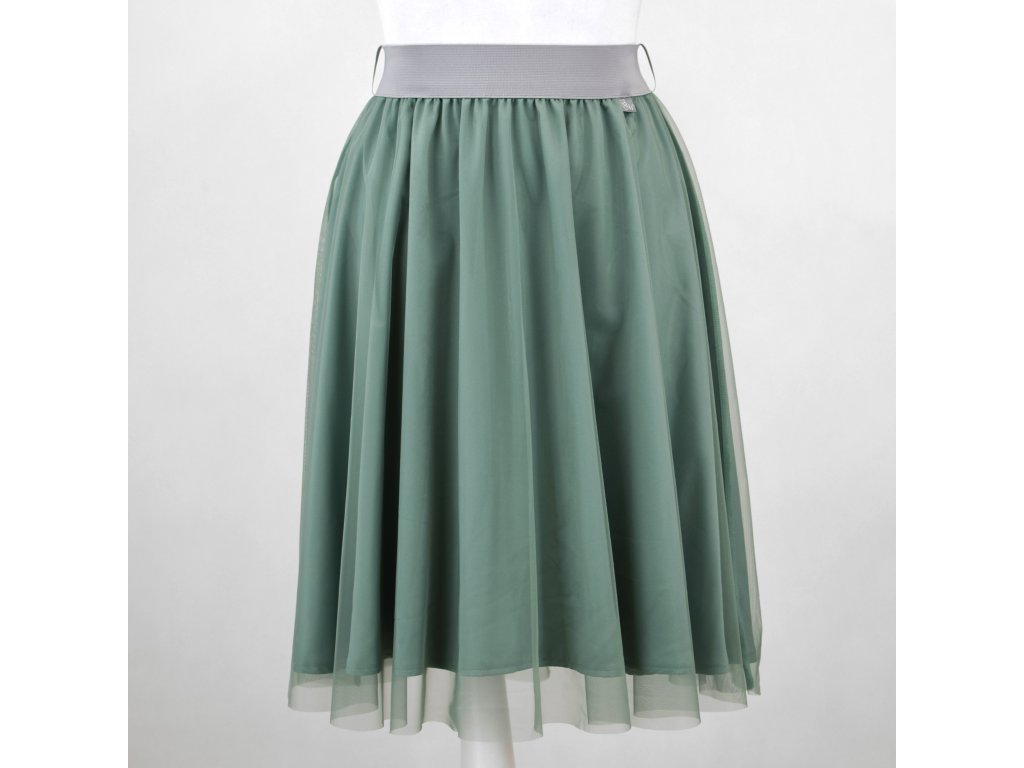 Dámská sukně s elastickou gumou do pasu, půlkolového střihu, s tylem. Sukně nemá podšívku. Délka je měřena bez tylu - tyl přesahuje cca o 5 cm přes sukni. Barva tylu je šedá, látka sukně zelená.