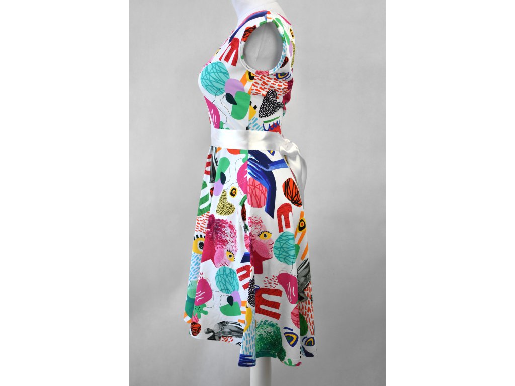 Dámské šaty s přinechanými rukávky a půlkolovou sukní. Jsou přestřižené v pase, lehce projmuté, s prodlouženým zadním dílem. Mají mírný lodičkový výstřih, v pase poutka na stuhu (můžou se lehce odstranit). Kapsy v bocích nesmí chybět... :)