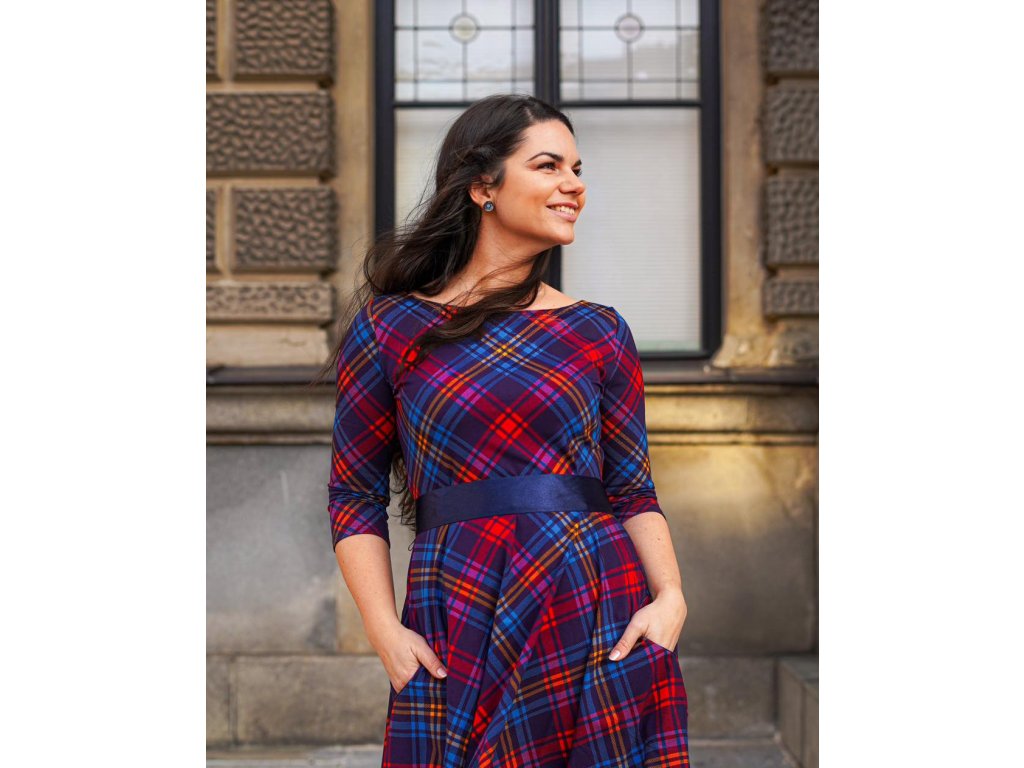 Dámské šaty s 3/4 rukávy a půlkolovou sukní. Jsou přestřižené v pase, lehce projmuté, s prodlouženým zadním dílem. Mají mírný lodičkový výstřih, v pase poutka na stuhu (můžou se lehce odstranit). Kapsy v bocích nesmí chybět... :)