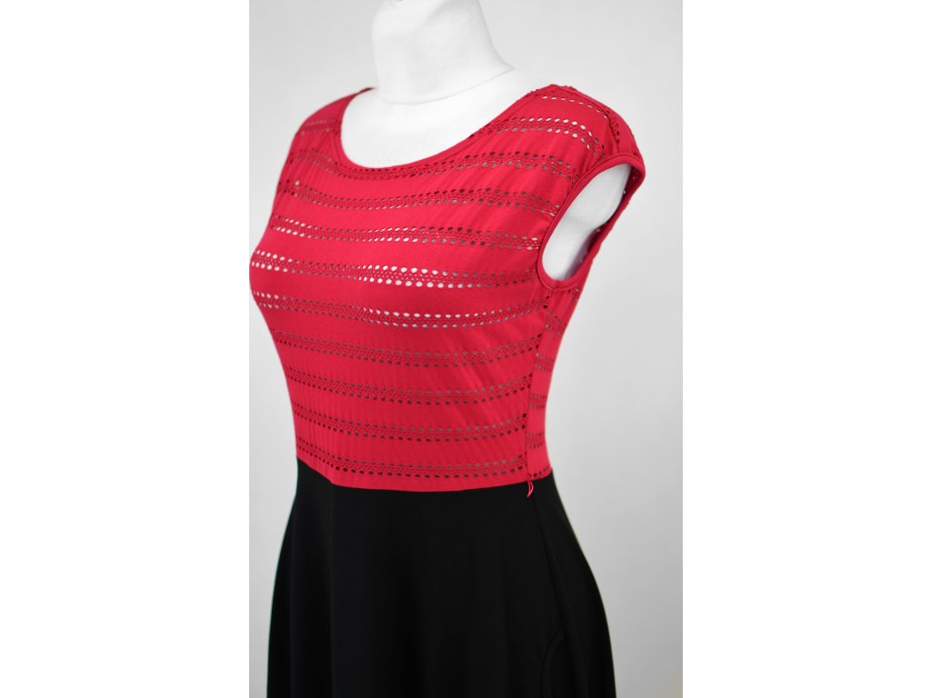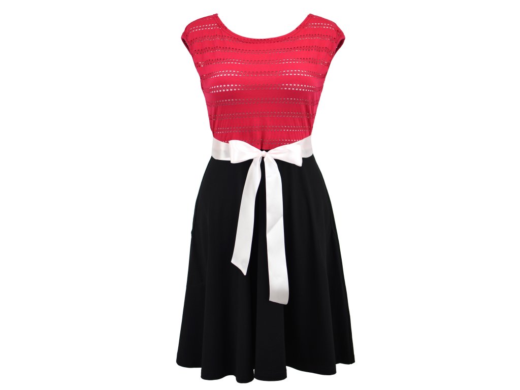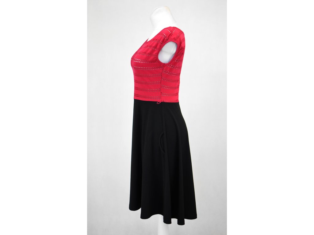 Dámské šaty s přinechanými rukávky a půlkolovou sukní. Jsou přestřižené v pase, lehce projmuté, s prodlouženým zadním dílem. Mají mírný lodičkový výstřih, v pase poutka na stuhu (můžou se lehce odstranit). Kapsy v bocích nesmí chybět... :)