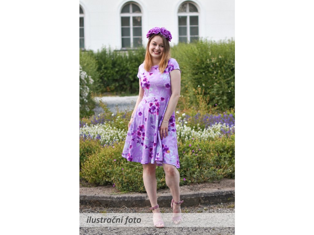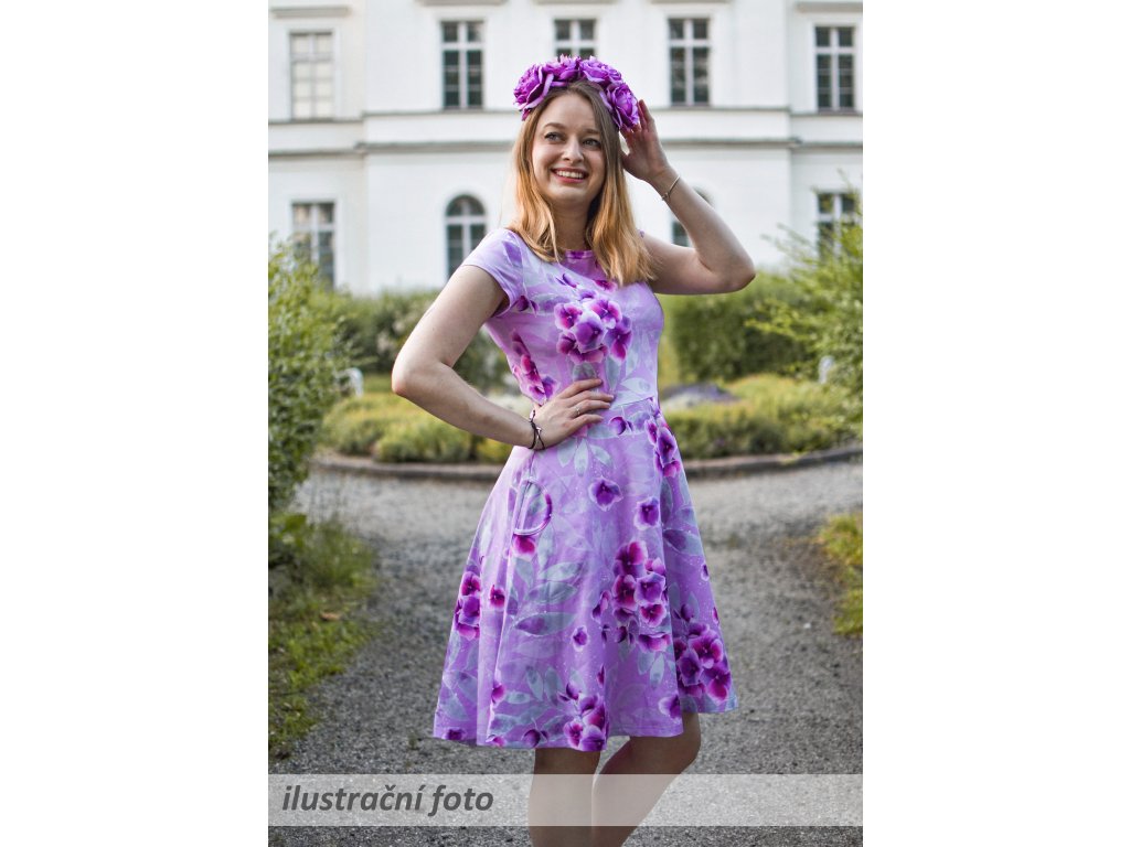 Dámské šaty s krátkými rukávy a půlkolovou sukní. Jsou přestřižené v pase, lehce projmuté, s prodlouženým zadním dílem. Mají mírný lodičkový výstřih, v pase poutka na stuhu (můžou se lehce odstranit). Kapsy v bocích nesmí chybět... :)