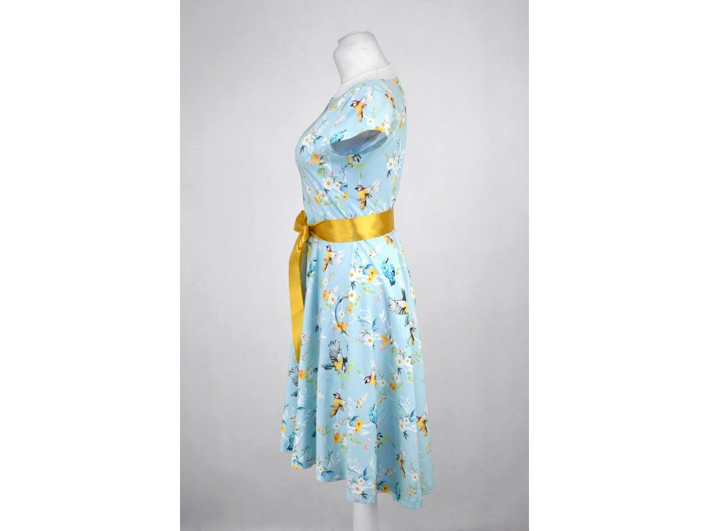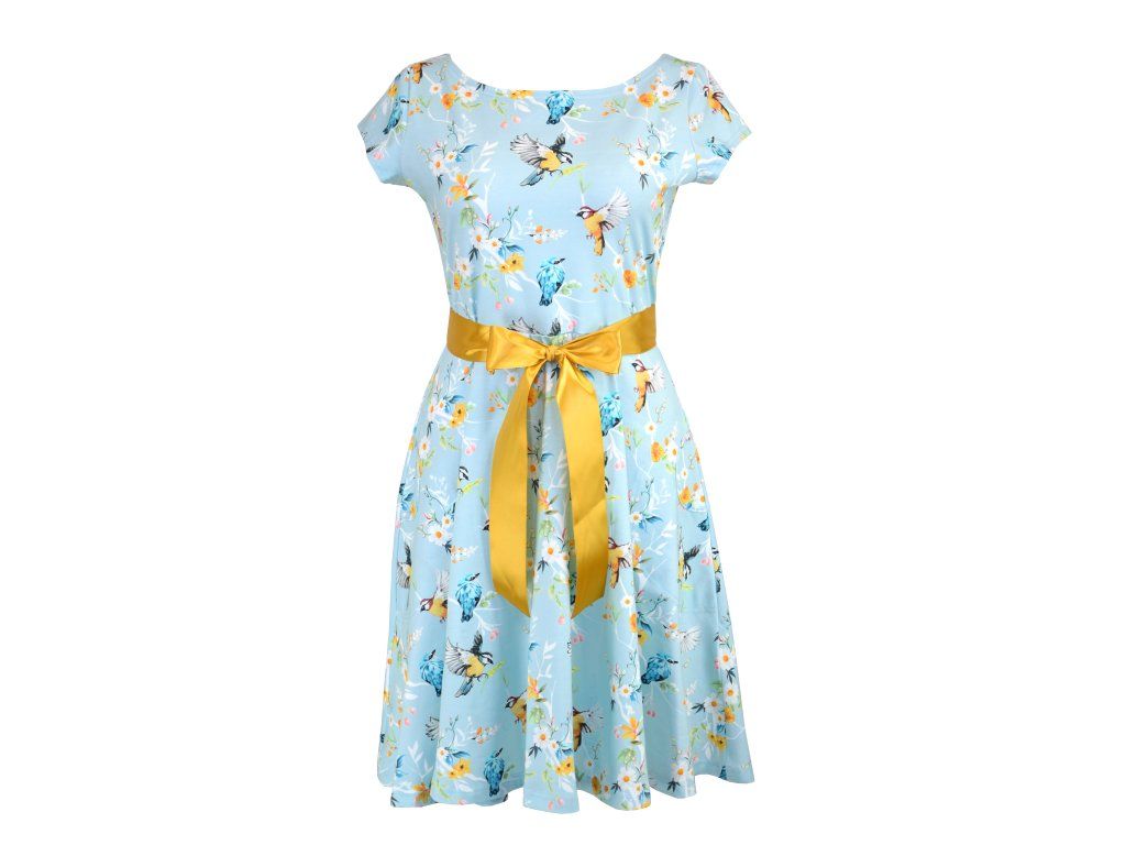 Dámské šaty s krátkými rukávy a půlkolovou sukní. Jsou přestřižené v pase, lehce projmuté, s prodlouženým zadním dílem. Mají mírný lodičkový výstřih, v pase poutka na stuhu (můžou se lehce odstranit). Kapsy v bocích nesmí chybět... :)