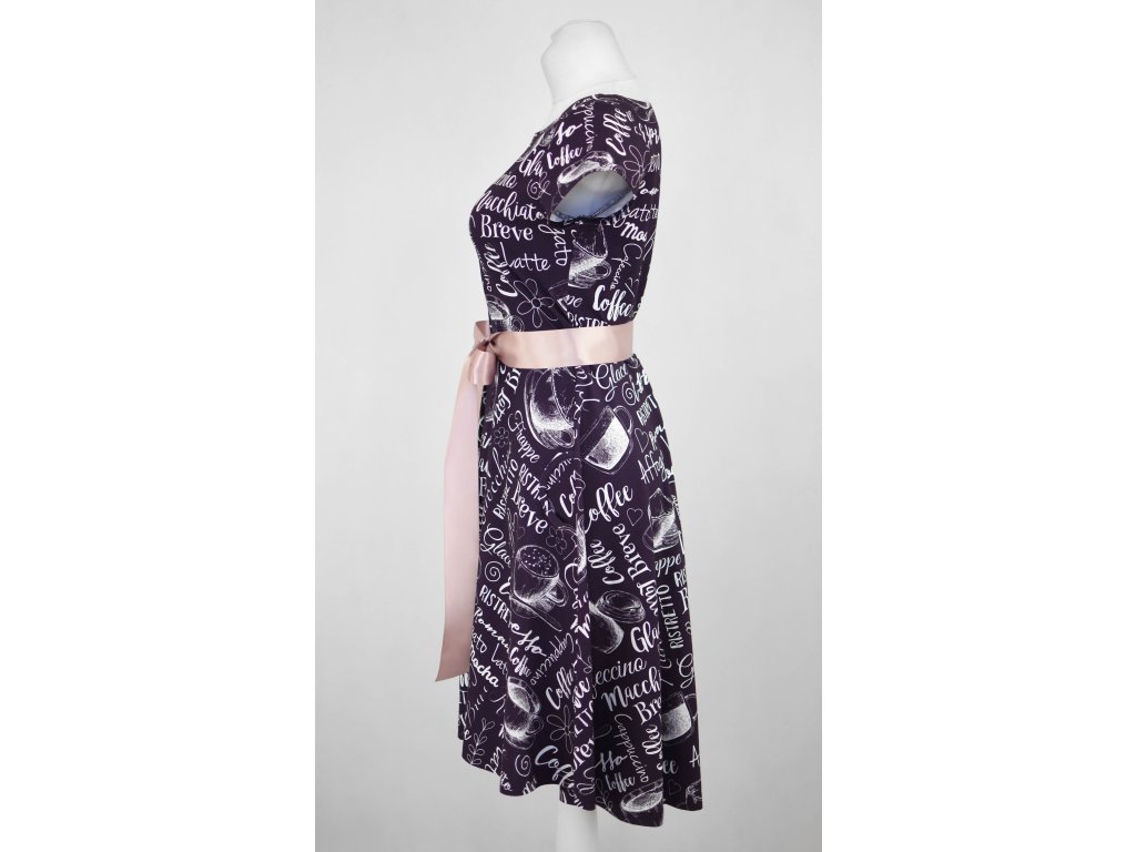 Dámské šaty s krátkými rukávy a půlkolovou sukní. Jsou přestřižené v pase, lehce projmuté, s prodlouženým zadním dílem. Mají mírný lodičkový výstřih, v pase poutka na stuhu (můžou se lehce odstranit). Kapsy v bocích nesmí chybět... :)