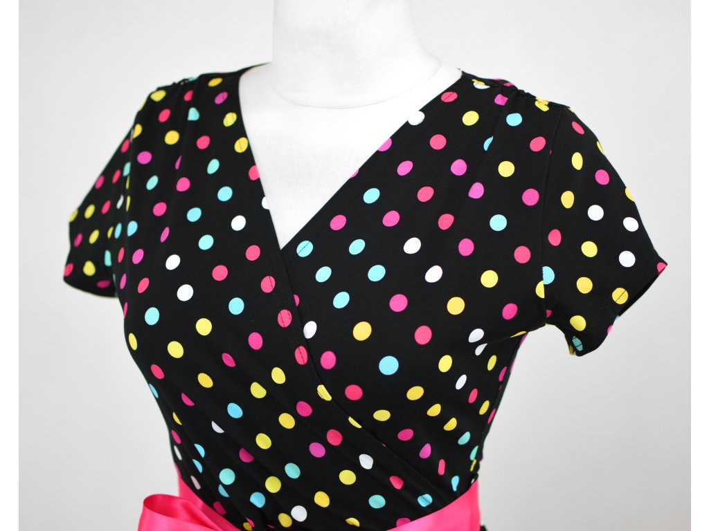 Půlkolové šaty s křížením - krátký rukáv - puntíkaté