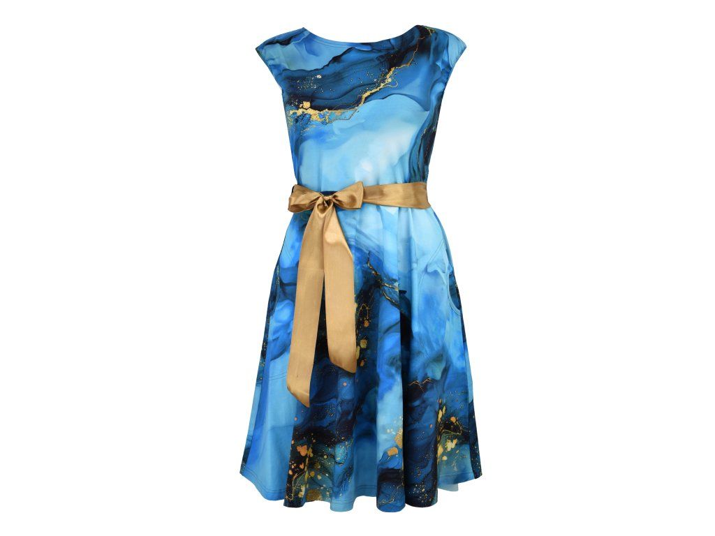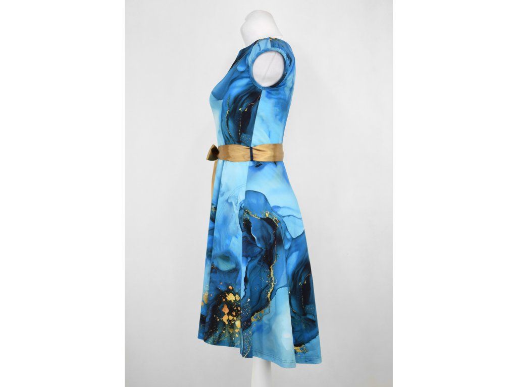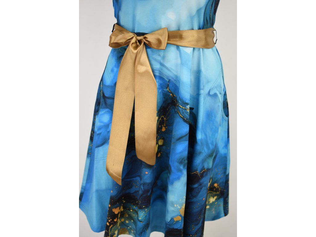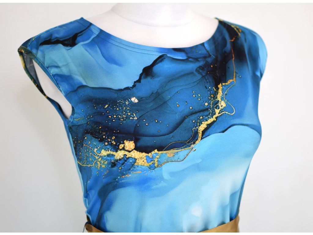 Dámské šaty s přinechanými rukávky a půlkolovou sukní. Jsou přestřižené v pase, lehce projmuté, s prodlouženým zadním dílem. Mají mírný lodičkový výstřih, v pase poutka na stuhu (můžou se lehce odstranit). Kapsy v bocích nesmí chybět... :)