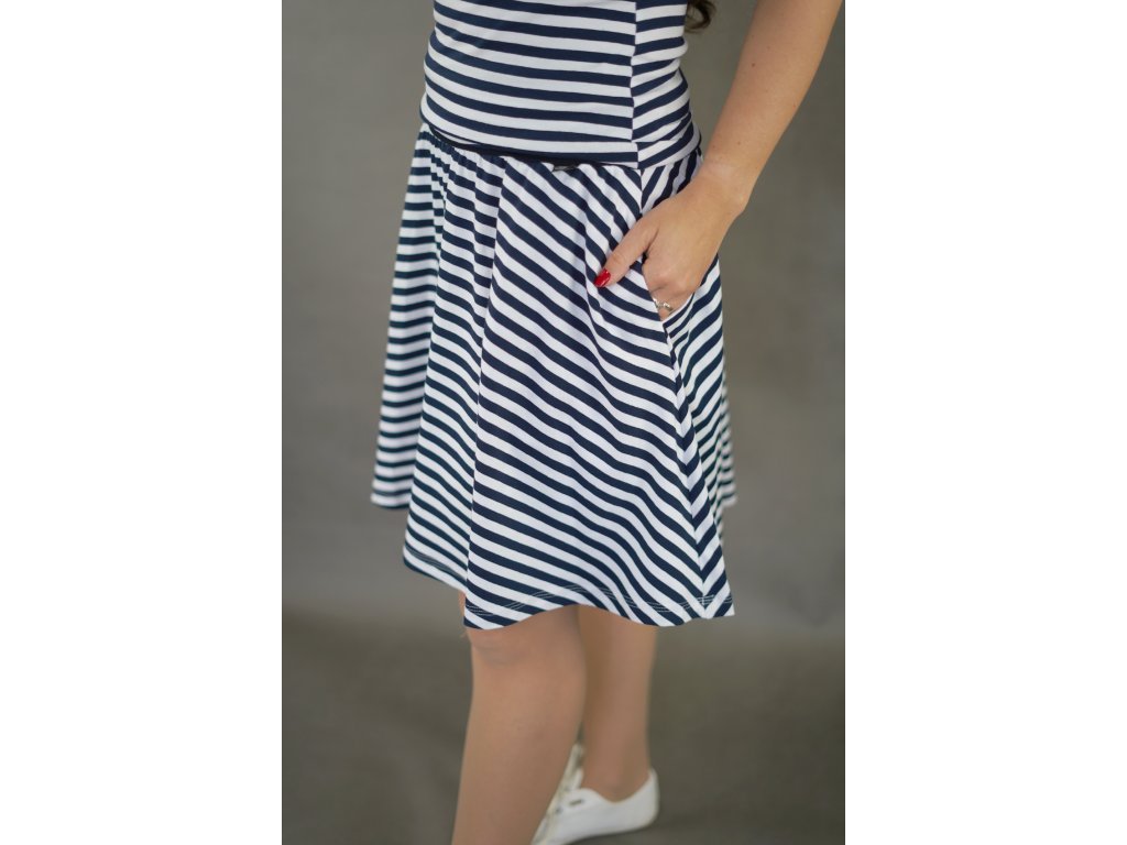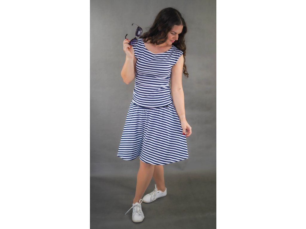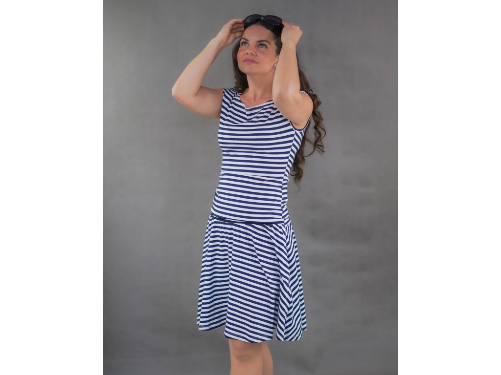 Půlkolové šaty přestřižené v bocích s pasovým nápletem, dají se tak podkasat - každý kdo jak preferuje. Lodičkový výstřih. Dvě schované kapsy v bocích nesmí chybět.