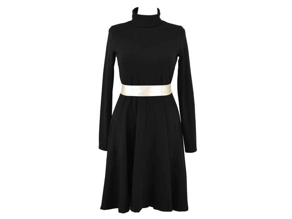 Dámské šaty s rolákem, dlouhými rukávy a půlkolovou sukní. Jsou přestřižené v pase, lehce projmuté, s prodlouženým zadním dílem. V pase mají poutka na stuhu (můžou se lehce odstranit). Kapsy v bocích nesmí chybět... :)