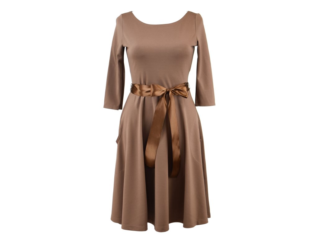 Dámské šaty s 3/4 rukávy a půlkolovou sukní. Jsou přestřižené v pase, lehce projmuté, s prodlouženým zadním dílem. Mají mírný lodičkový výstřih, v pase poutka na stuhu (můžou se lehce odstranit). Kapsy v bocích nesmí chybět... :) S výšivkou loga BM na sukni.