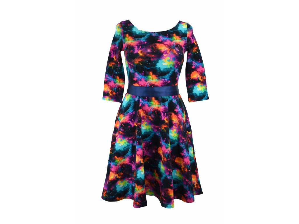 Půlkolové šaty 3/4 rukáv - barevná galaxie