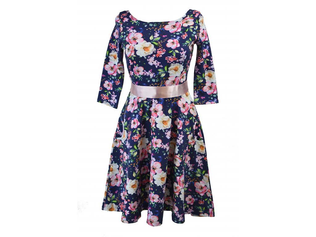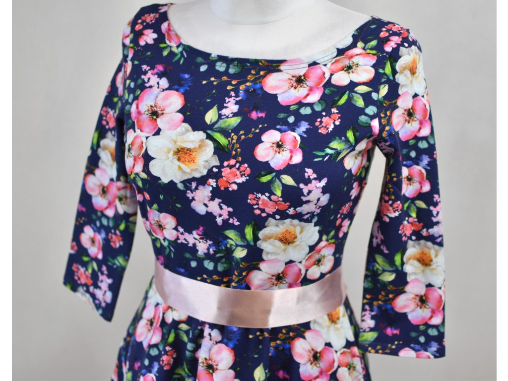 Dámské šaty s 3/4 rukávy a půlkolovou sukní. Jsou přestřižené v pase, lehce projmuté, s prodlouženým zadním dílem. Mají mírný lodičkový výstřih, v pase poutka na stuhu (můžou se lehce odstranit). Kapsy v bocích nesmí chybět... :)