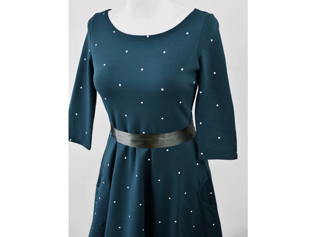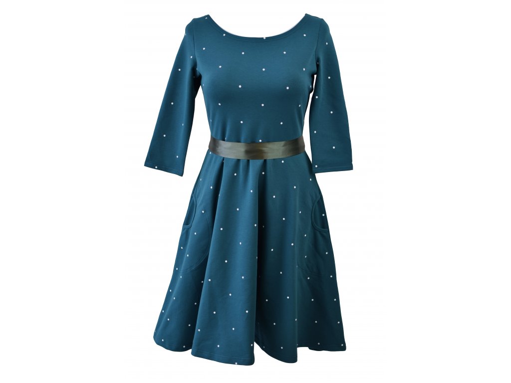 Půlkolové šaty 3/4 rukáv - středně modré a puntík