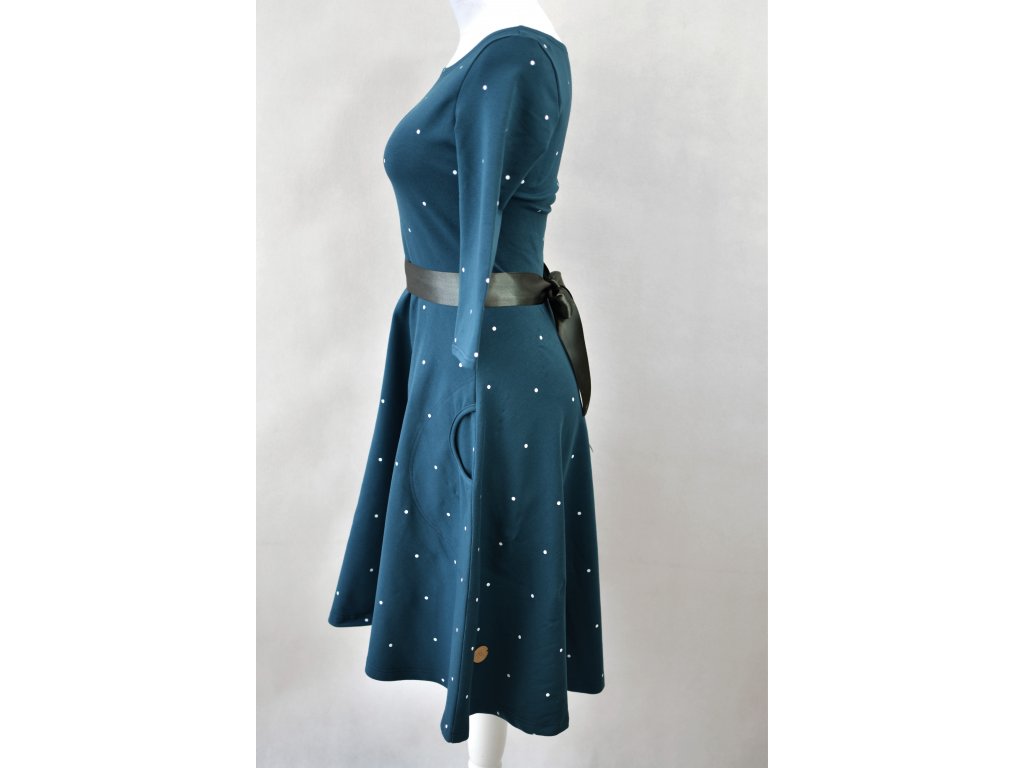 Dámské šaty s 3/4 rukávy a půlkolovou sukní. Jsou přestřižené v pase, lehce projmuté, s prodlouženým zadním dílem. Mají mírný lodičkový výstřih, v pase poutka na stuhu (můžou se lehce odstranit). Kapsy v bocích nesmí chybět... :)