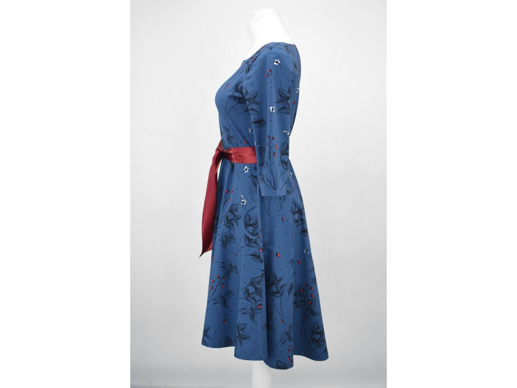 Dámské šaty s 3/4 rukávy a půlkolovou sukní. Jsou přestřižené v pase, lehce projmuté, s prodlouženým zadním dílem. Mají mírný lodičkový výstřih, v pase poutka na stuhu (můžou se lehce odstranit). Kapsy v bocích nesmí chybět... :)