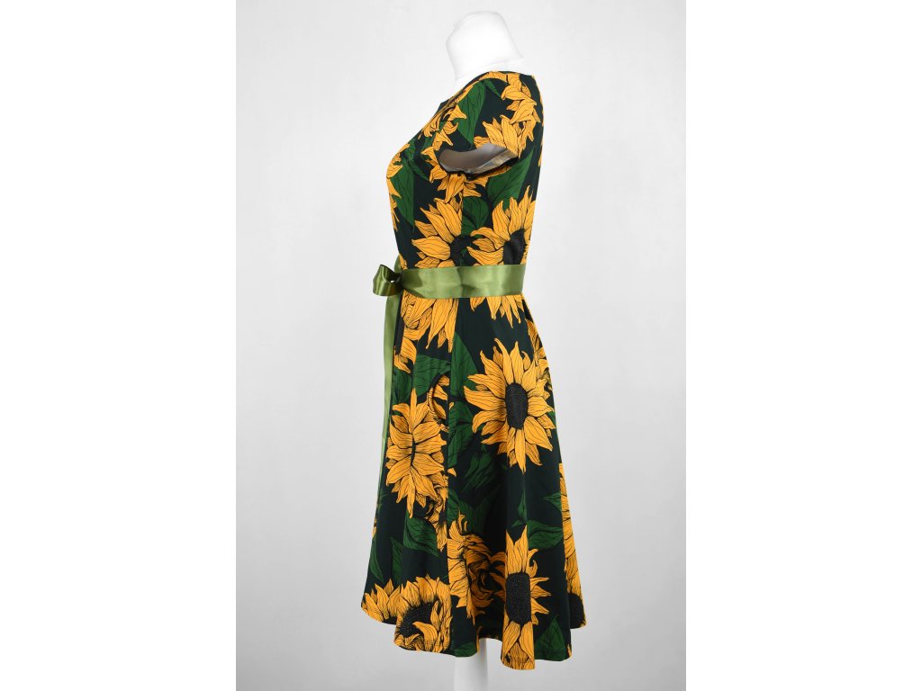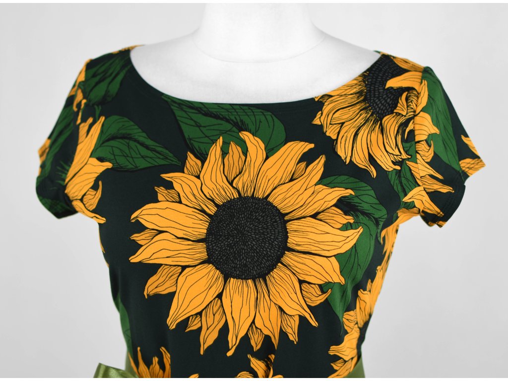 Dámské šaty s krátkými rukávy a půlkolovou sukní. Jsou přestřižené v pase, lehce projmuté, s prodlouženým zadním dílem. Mají mírný lodičkový výstřih, v pase poutka na stuhu (můžou se lehce odstranit). Kapsy v bocích nesmí chybět... :)