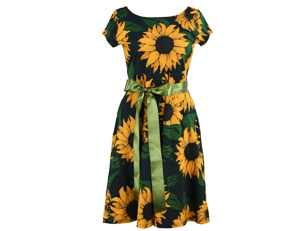 Dámské šaty s krátkými rukávy a půlkolovou sukní. Jsou přestřižené v pase, lehce projmuté, s prodlouženým zadním dílem. Mají mírný lodičkový výstřih, v pase poutka na stuhu (můžou se lehce odstranit). Kapsy v bocích nesmí chybět... :)