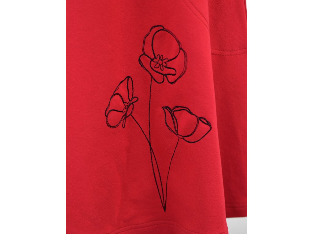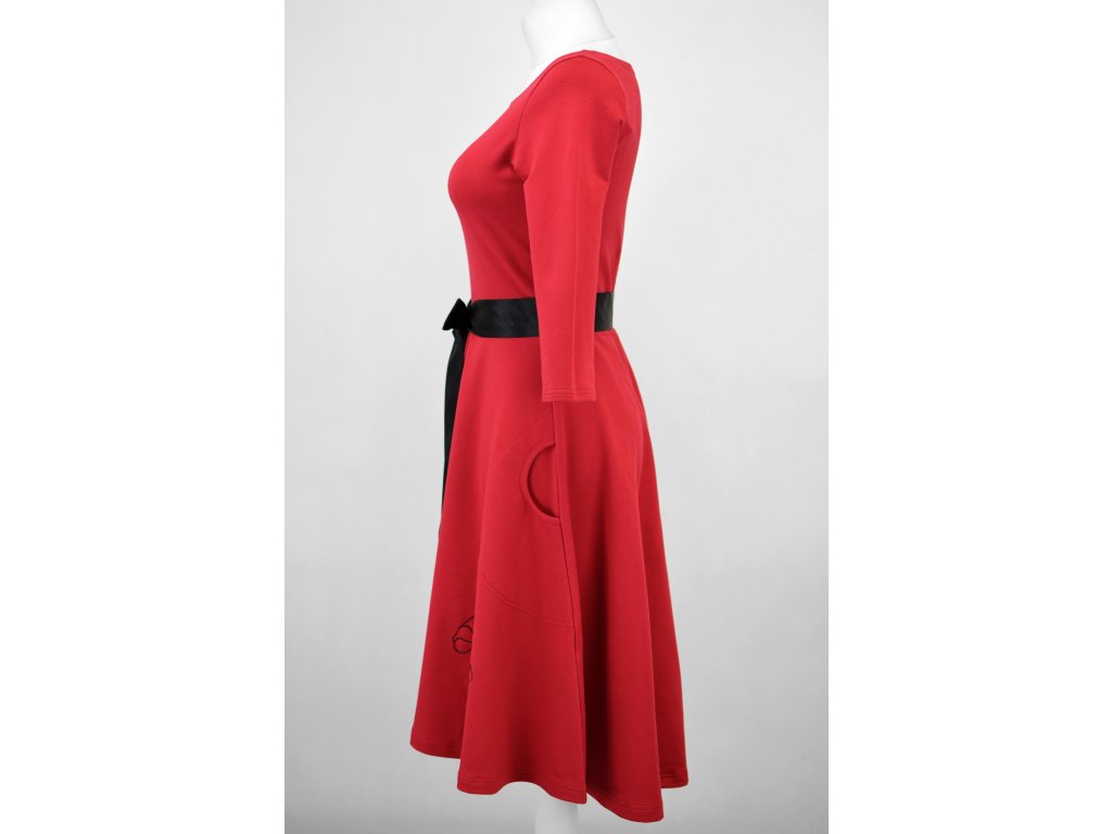 Dámské šaty s 3/4 rukávy a půlkolovou sukní. Jsou přestřižené v pase, lehce projmuté, s prodlouženým zadním dílem. Mají mírný lodičkový výstřih, v pase poutka na stuhu (můžou se lehce odstranit). Kapsy v bocích nesmí chybět... :)