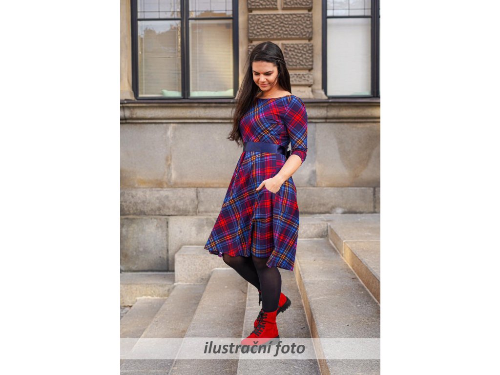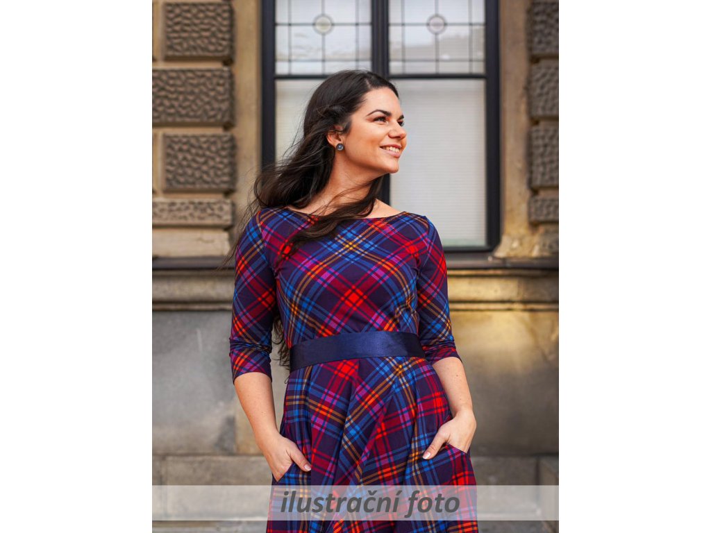 Dámské šaty s 3/4 rukávy a půlkolovou sukní. Jsou přestřižené v pase, lehce projmuté, s prodlouženým zadním dílem. Mají mírný lodičkový výstřih, v pase poutka na stuhu (můžou se lehce odstranit). Kapsy v bocích nesmí chybět... :)