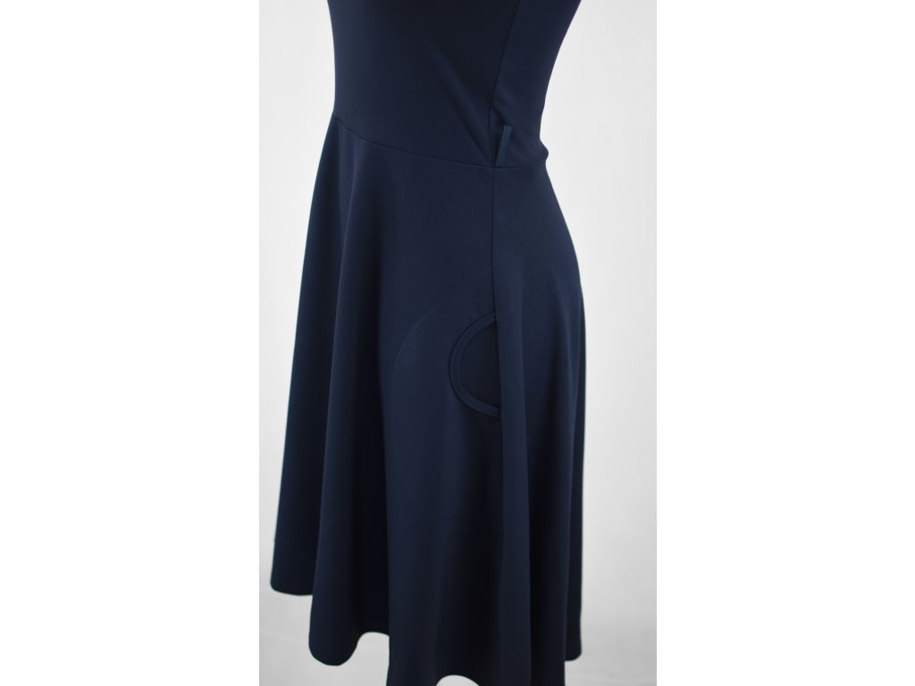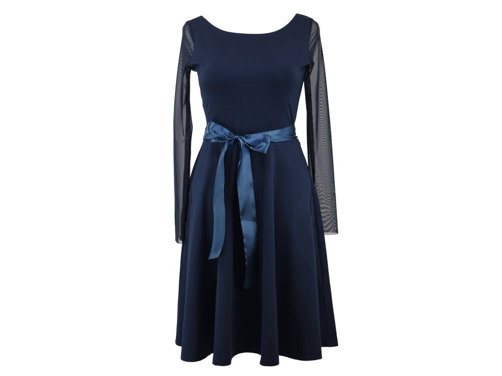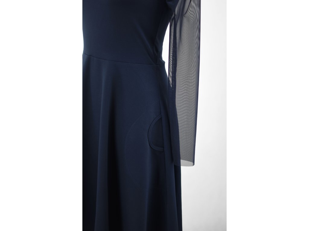 Dámské šaty s dlouhými tylovými rukávy a půlkolovou sukní. Jsou přestřižené v pase, lehce projmuté, s prodlouženým zadním dílem. Mají mírný lodičkový výstřih, v pase poutka na stuhu (můžou se lehce odstranit), kapsy v bocích. Rukávy jsou z jemného hladkého tylu, pruží a lehce se leskne, na konci je nezačištěný. S výšivkou loga BM na sukni.