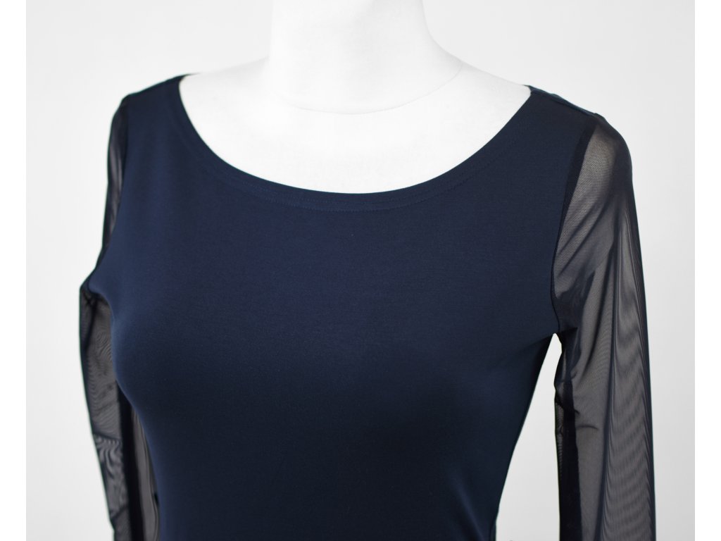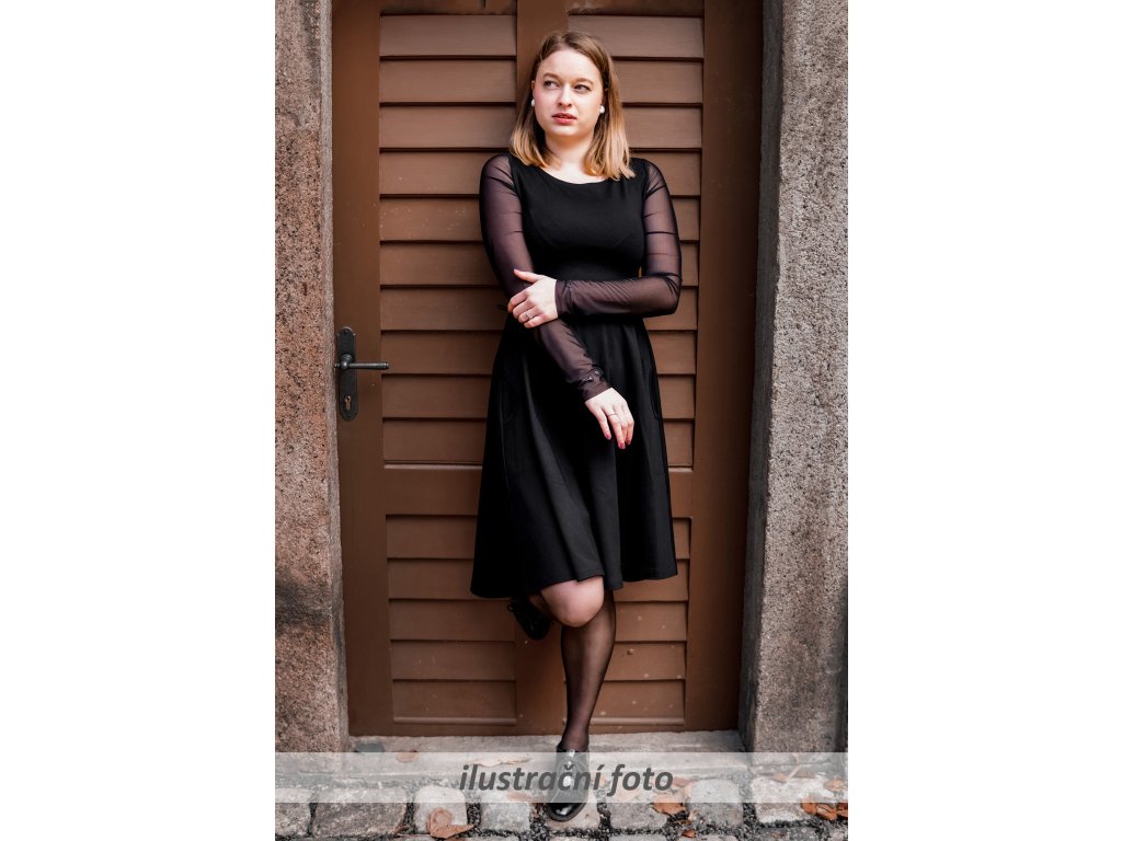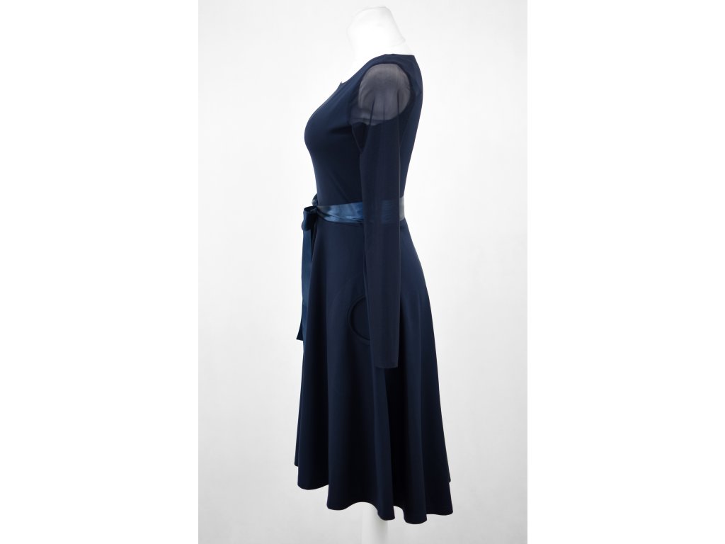 Dámské šaty s dlouhými tylovými rukávy a půlkolovou sukní. Jsou přestřižené v pase, lehce projmuté, s prodlouženým zadním dílem. Mají mírný lodičkový výstřih, v pase poutka na stuhu (můžou se lehce odstranit), kapsy v bocích. Rukávy jsou z jemného hladkého tylu, pruží a lehce se leskne, na konci je nezačištěný. S výšivkou loga BM na sukni.