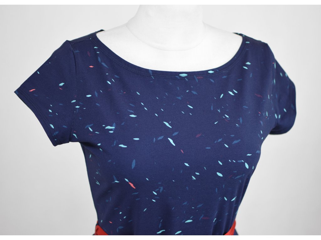 Dámské šaty s krátkými rukávy a půlkolovou sukní. Jsou přestřižené v pase, lehce projmuté, s prodlouženým zadním dílem. Mají mírný lodičkový výstřih, v pase poutka na stuhu (můžou se lehce odstranit). Kapsy v bocích nesmí chybět... :)