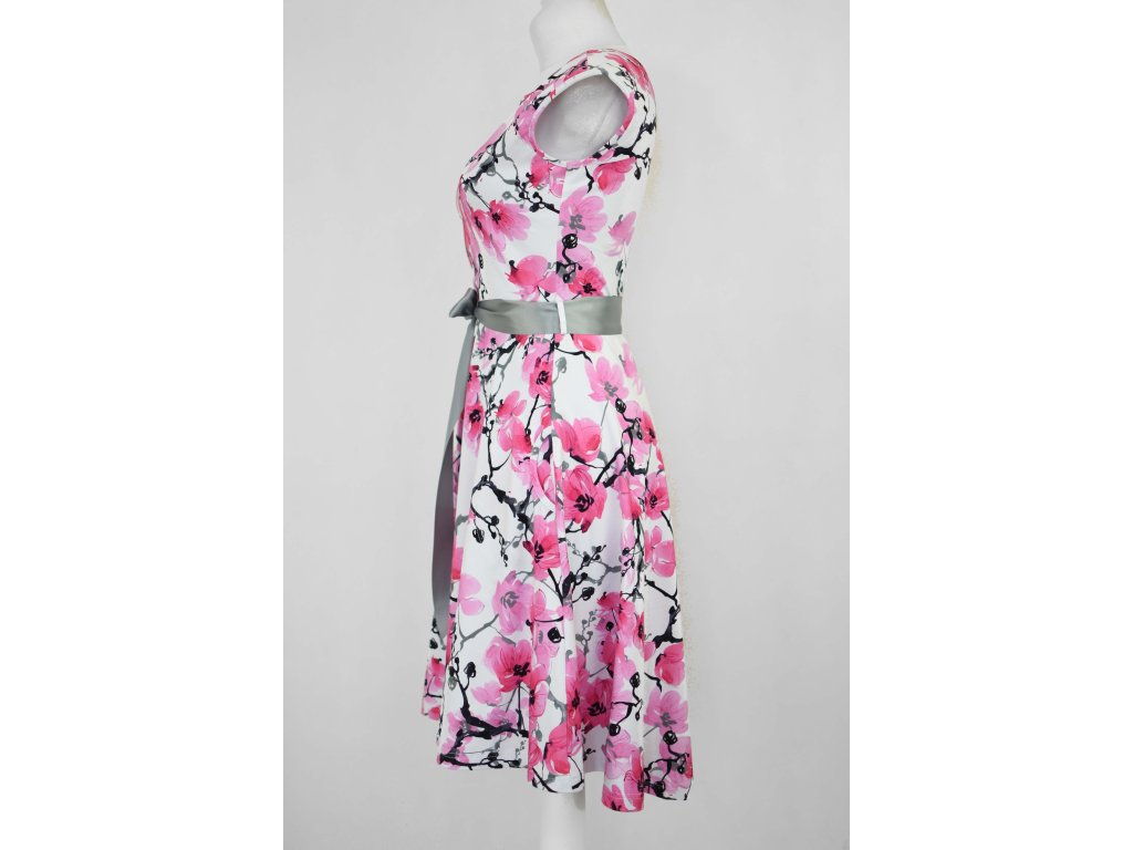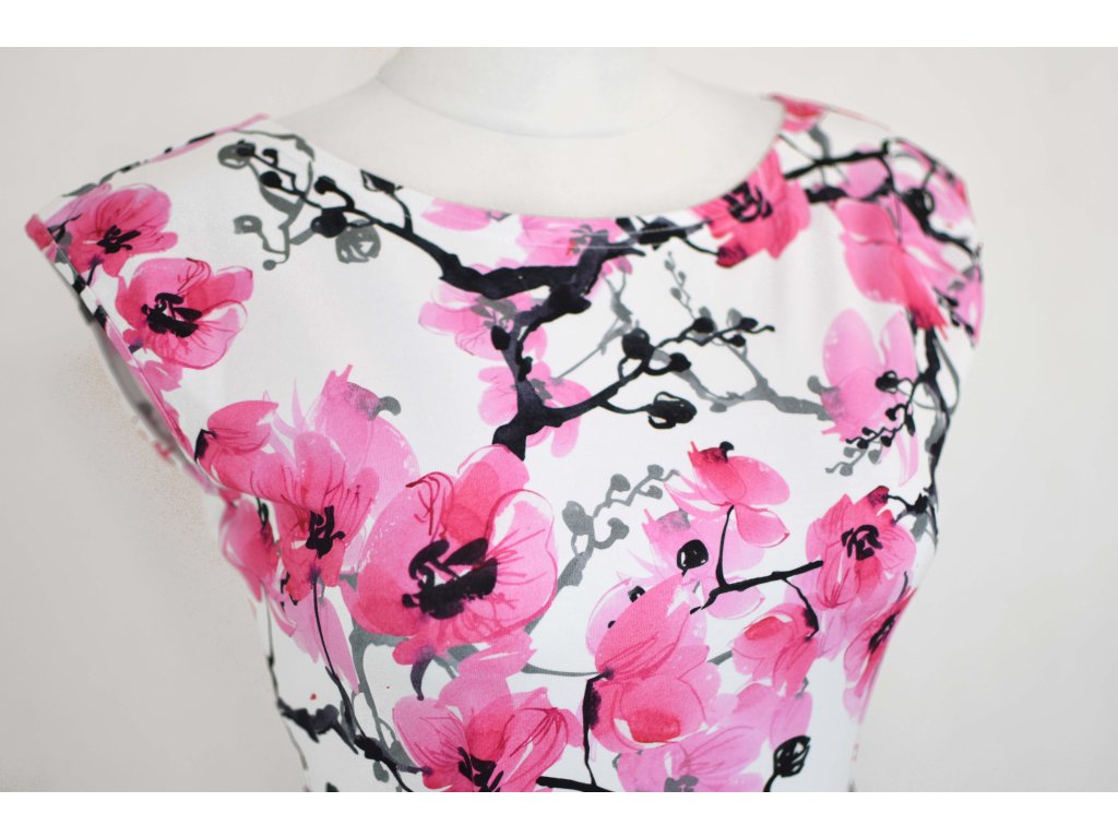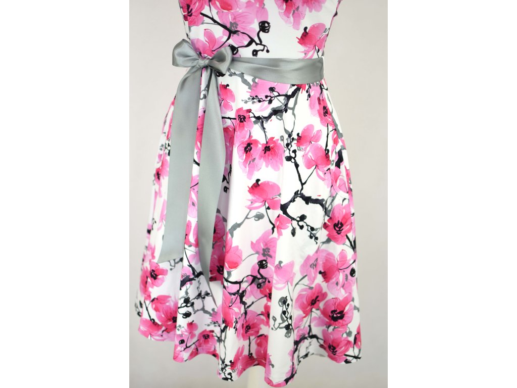 Dámské šaty s přinechanými rukávky a půlkolovou sukní. Jsou přestřižené v pase, lehce projmuté, s prodlouženým zadním dílem. Mají mírný lodičkový výstřih, v pase poutka na stuhu (můžou se lehce odstranit). Kapsy v bocích nesmí chybět... :)