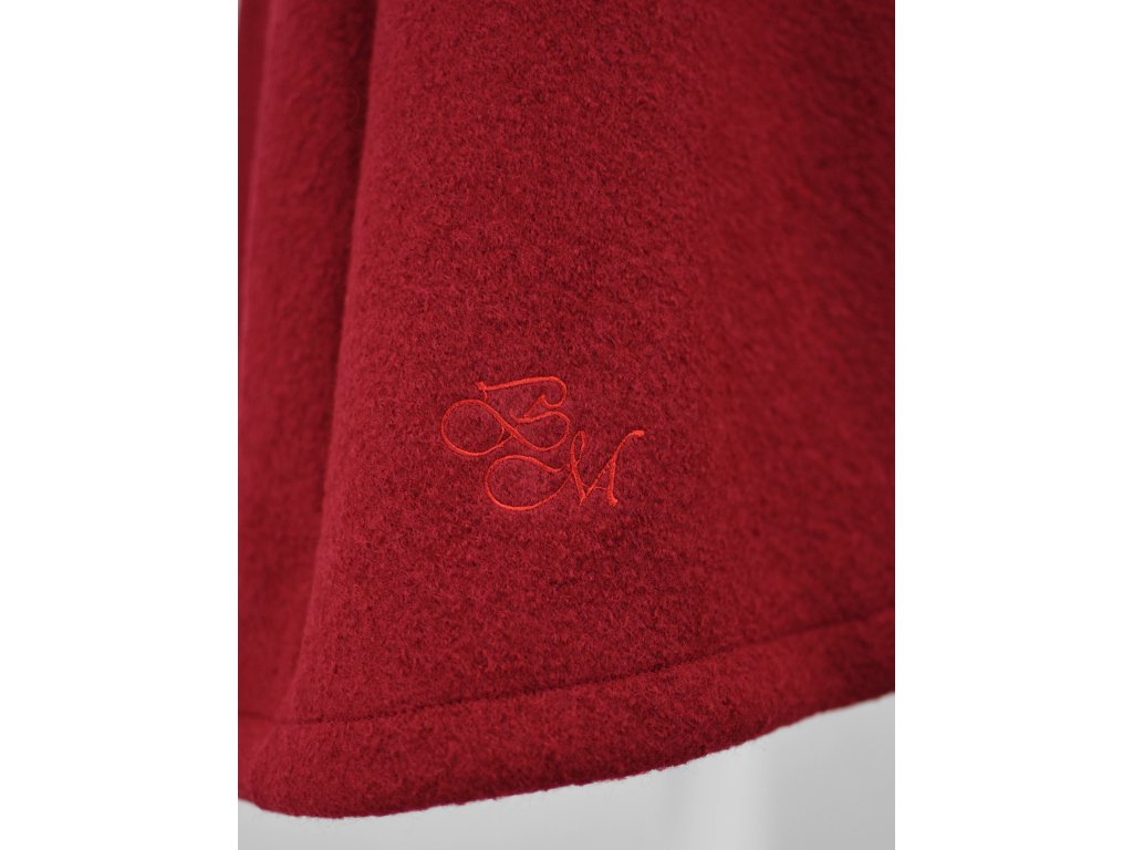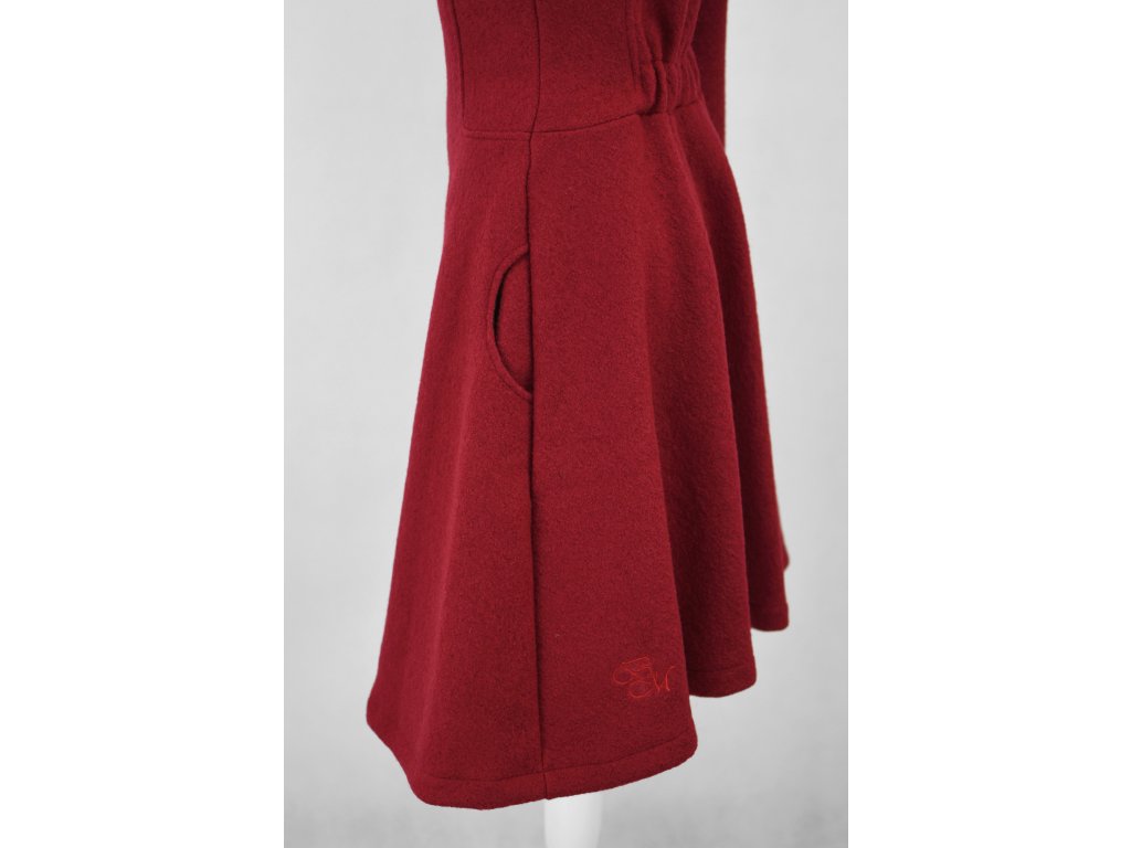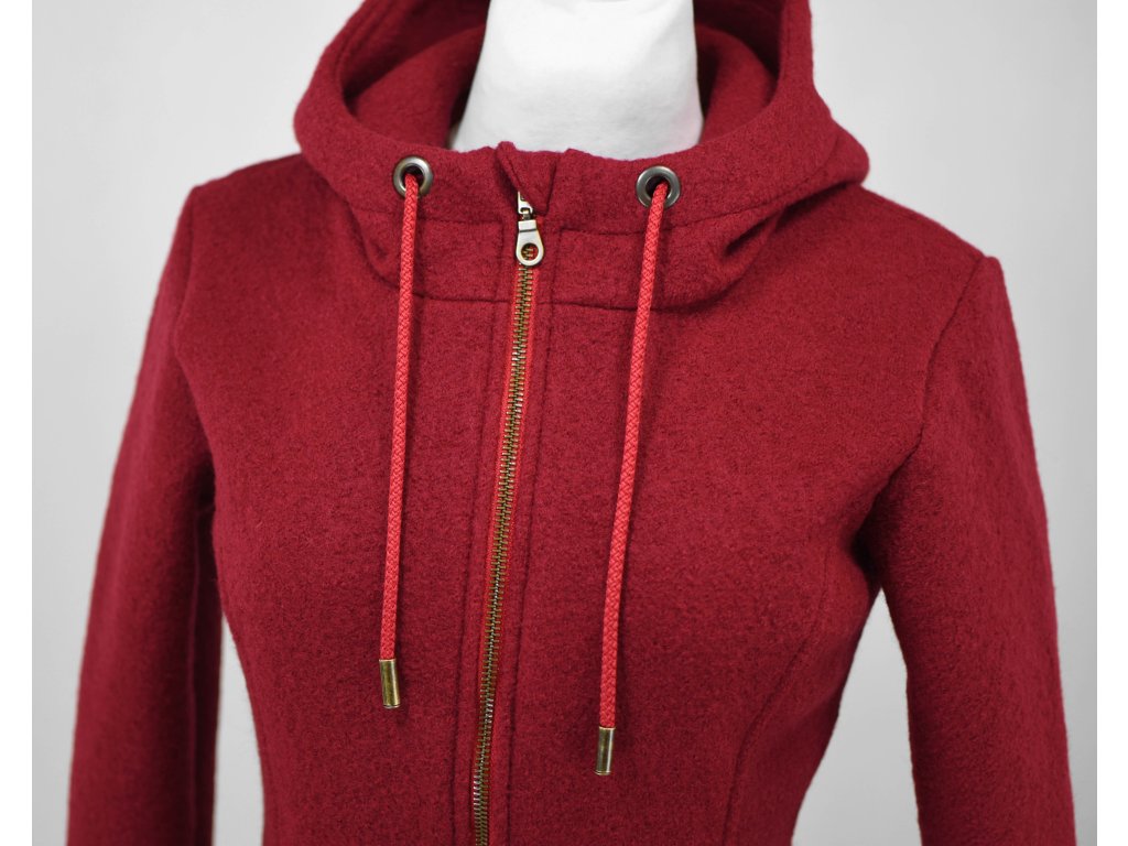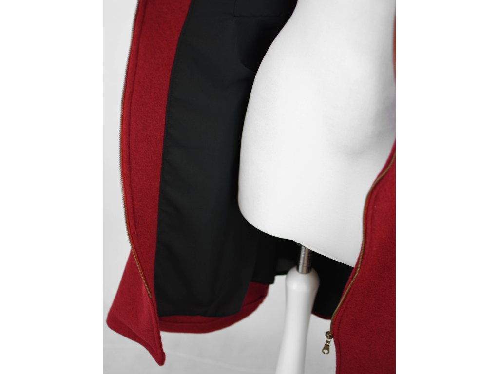 Dámský vlněný kabát půlkolového střihu. Střih je projmutý do pasu, zadní díl je stažený do pevně všité gumy. Spodek zadního dílu se lehce rozšiřuje a dolní lem je dokulata, na zadním díle je vyšité logo. V bočním švu jsou dvě kapsy - kapsový váček a kapsový průhmat je částečně ze softshellu a částečně z bavlněného úpletu (nebo plátna). Je kompletně vypodšívkovaný.