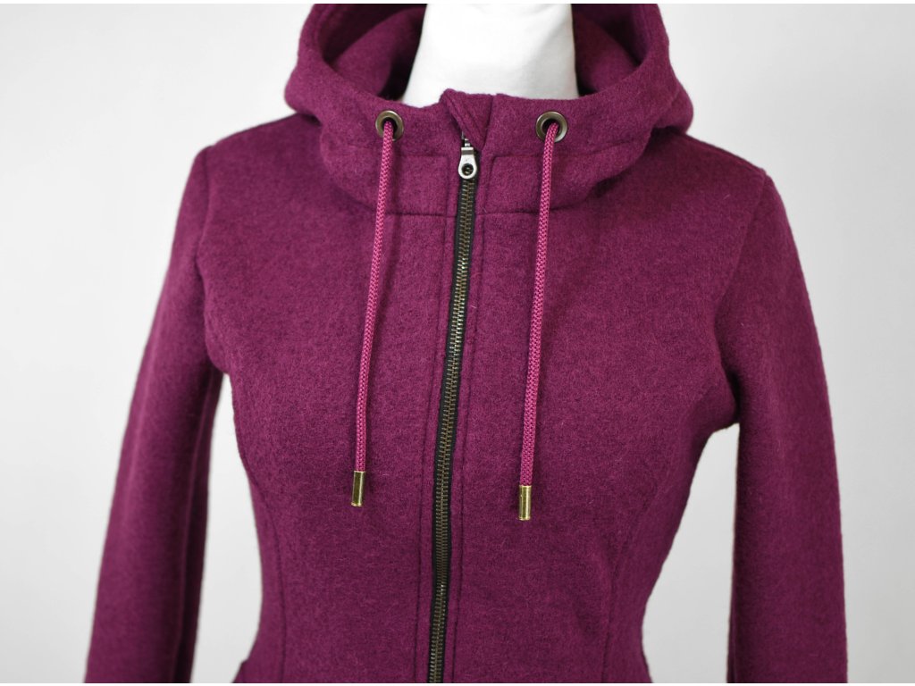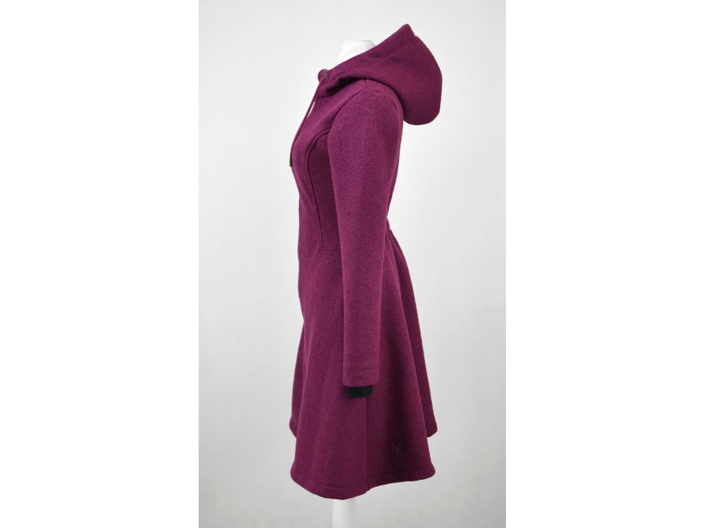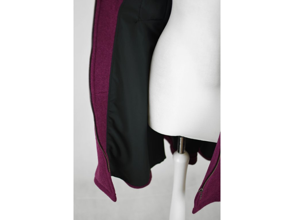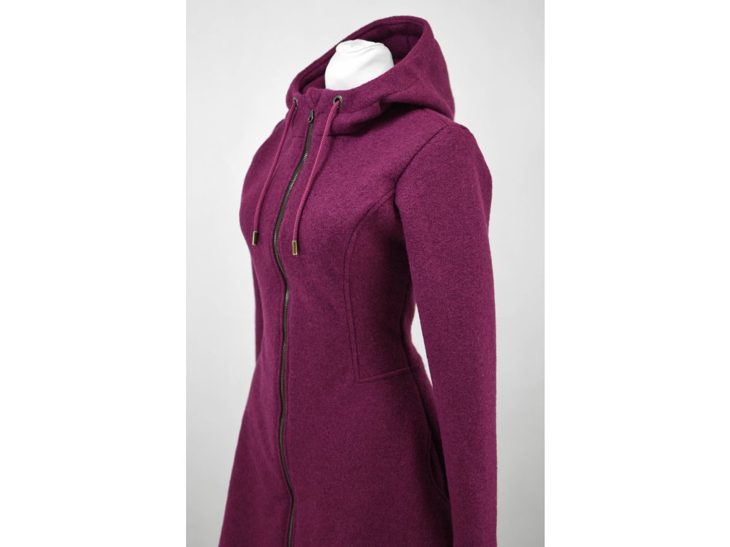 Dámský vlněný kabát půlkolového střihu. Střih je projmutý do pasu, zadní díl je stažený do pevně všité gumy. Spodek zadního dílu se lehce rozšiřuje a dolní lem je dokulata, na zadním díle je vyšité logo. V bočním švu jsou dvě kapsy - kapsový váček a kapsový průhmat je částečně ze softshellu a částečně z bavlněného úpletu (nebo plátna). Je kompletně vypodšívkovaný.