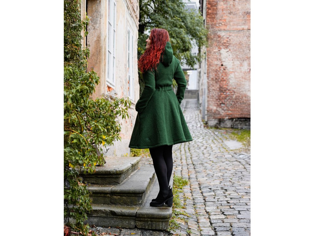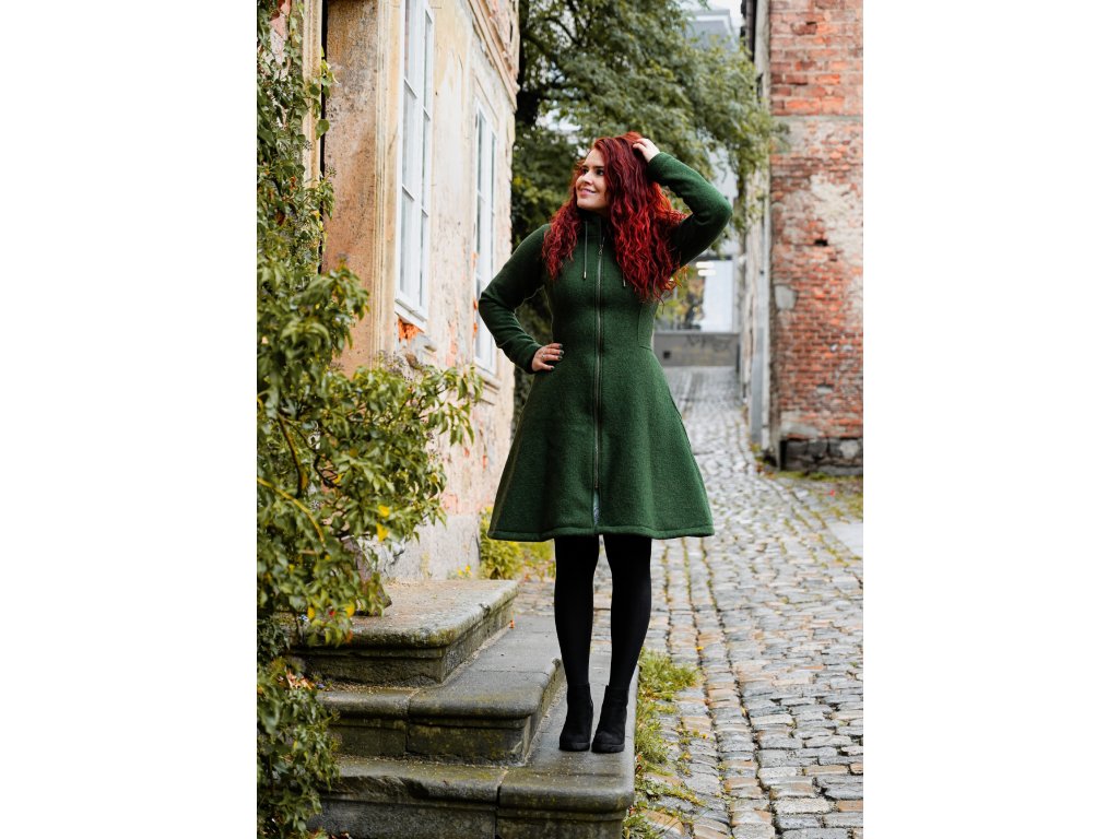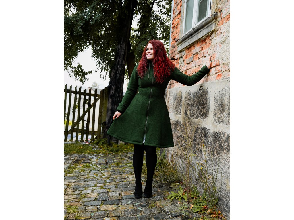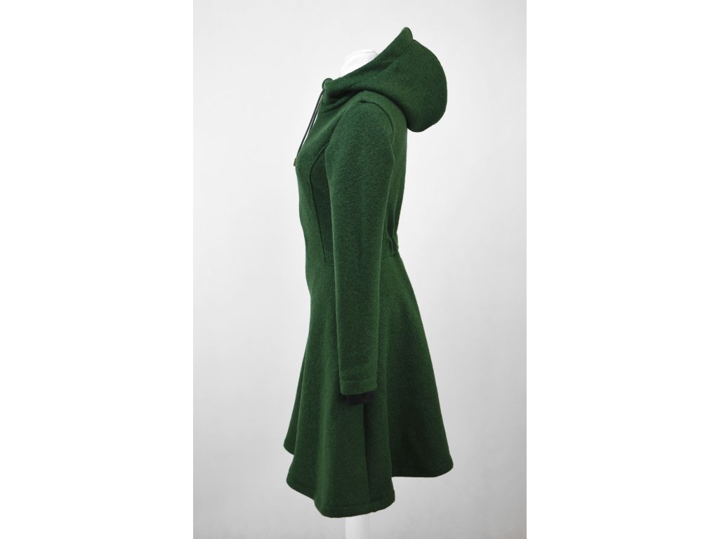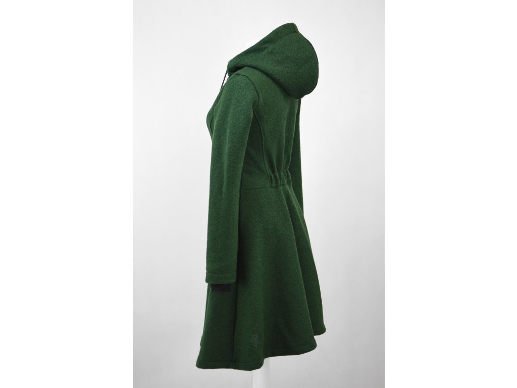 Dámský vlněný kabát půlkolového střihu. Střih je projmutý do pasu, zadní díl je stažený do pevně všité gumy. Spodek zadního dílu se lehce rozšiřuje a dolní lem je dokulata, na zadním díle je vyšité logo. V bočním švu jsou dvě kapsy - kapsový váček a kapsový průhmat je částečně ze softshellu a částečně z bavlněného úpletu (nebo plátna). Je kompletně vypodšívkovaný.