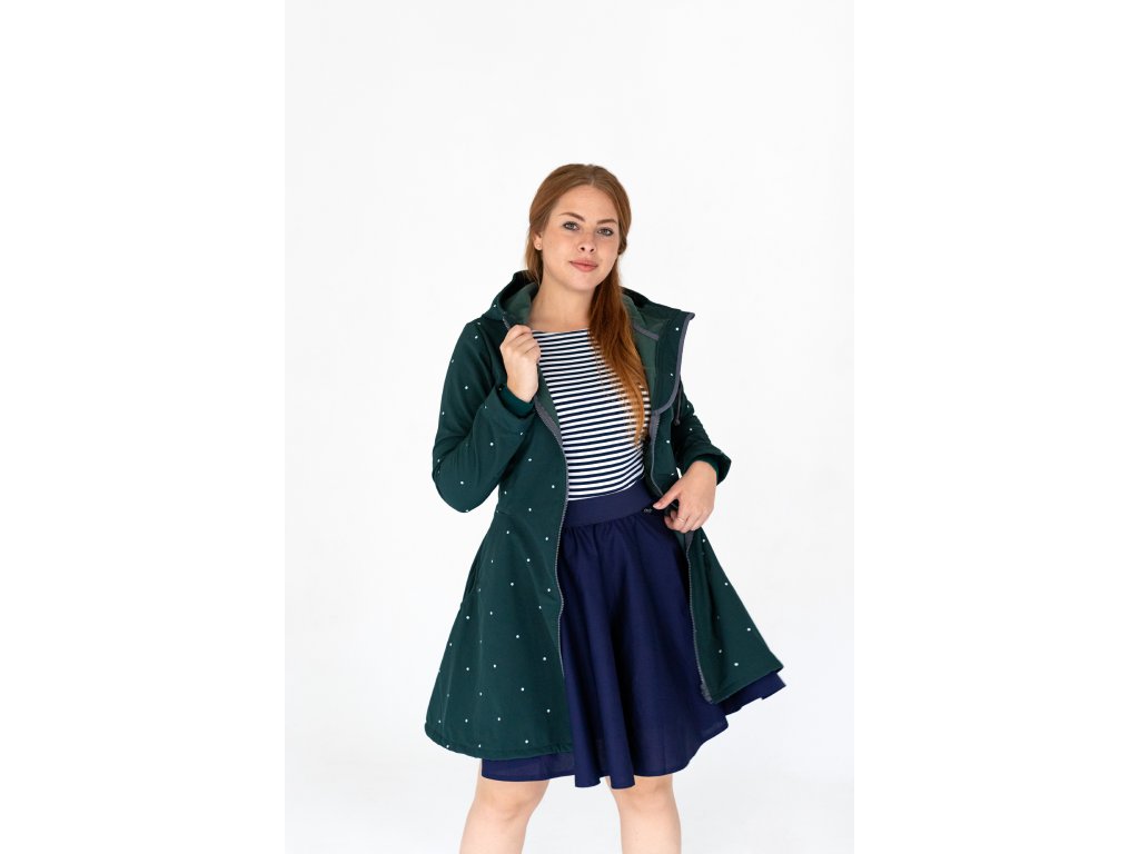 Dámský kabátek s půlkolovou sukní. Střih je projmutý do pasu, zadní díl je stažený do pevně všité gumy. Zádní délka je delší než přední část, spodek zadního dílu se lehce rozšiřuje a dolní lem je dokulata, na zadním díle je vyšité logo. V bočním švu jsou dvě kapsy - kapsový váček a kapsový průhmat je částečně ze softshellu a částečně z bavlněného úpletu (nebo plátna).