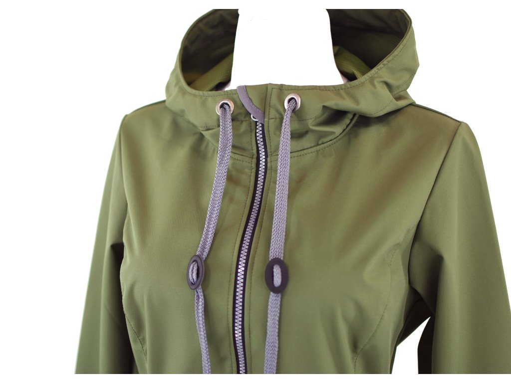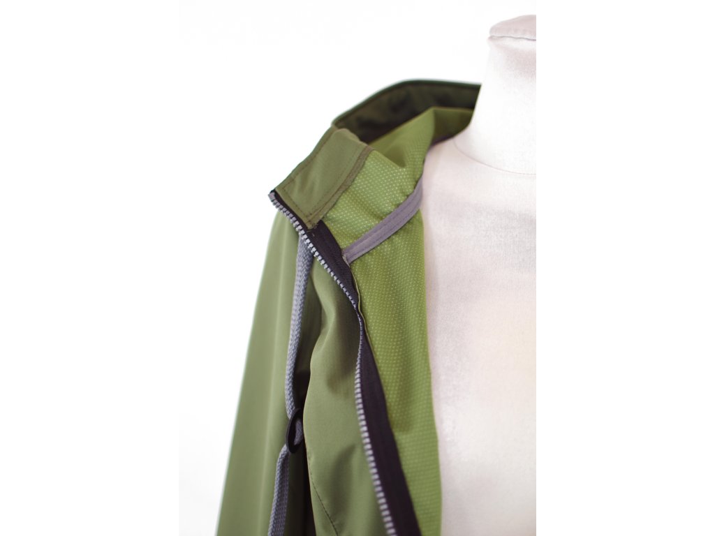 Kapuce je taktéž větší a praktičtější, dá se stáhnout šňůrkami, které jsou zakončeny koženkou. Zip je oboucestný a je u límce oddělen chráničem brady. Kabátek se dá opět stáhnout v dolní části gumičkami, je pak podkasanější - šňůrky s koženkou dole pod zipem tvoří jen praktický prvek pro svázání cípů, ty nemají stahující funkci.