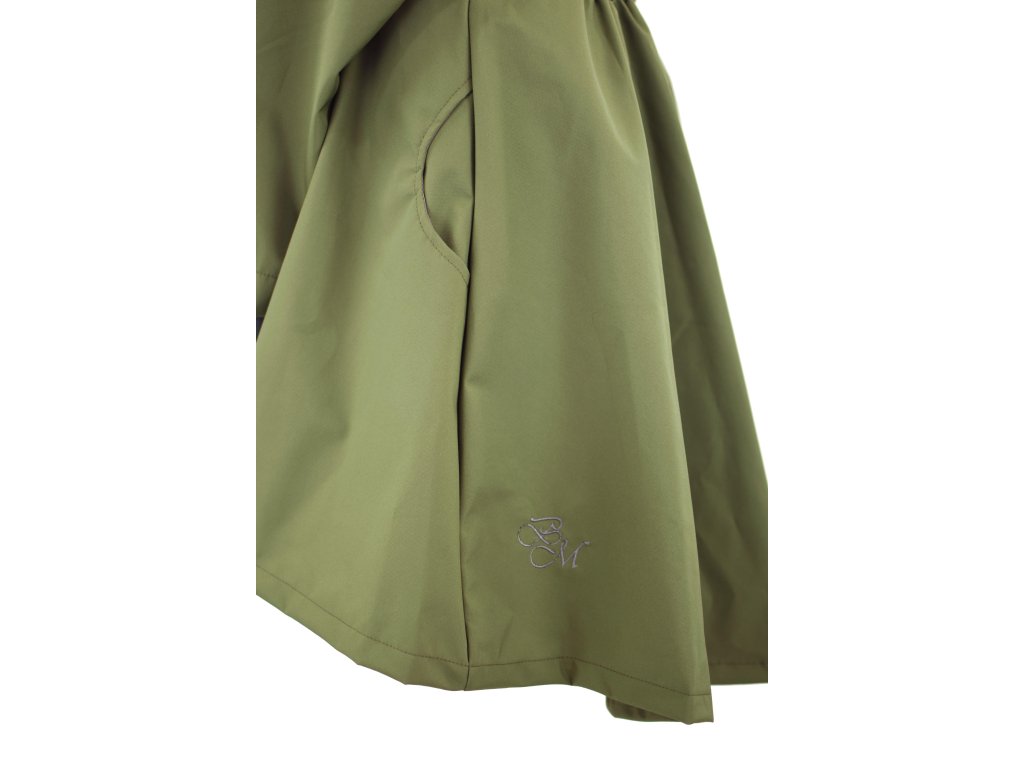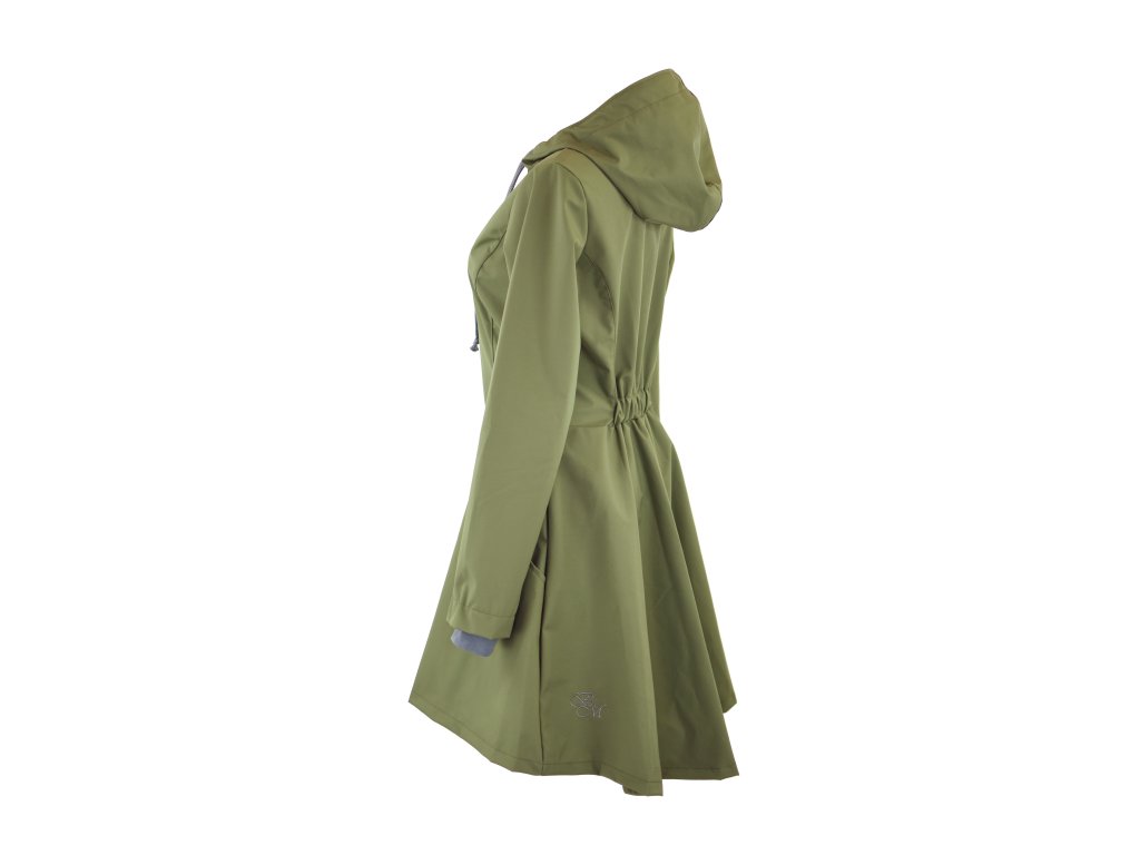 Dámský kabátek s půlkolovou sukní. Střih je projmutý do pasu, zadní díl je stažený do pevně všité gumy. Zádní délka je delší než přední část, spodek zadního dílu se lehce rozšiřuje a dolní lem je dokulata. V bočním švu jsou dvě kapsy. Na zadním díle je vyšité logo.