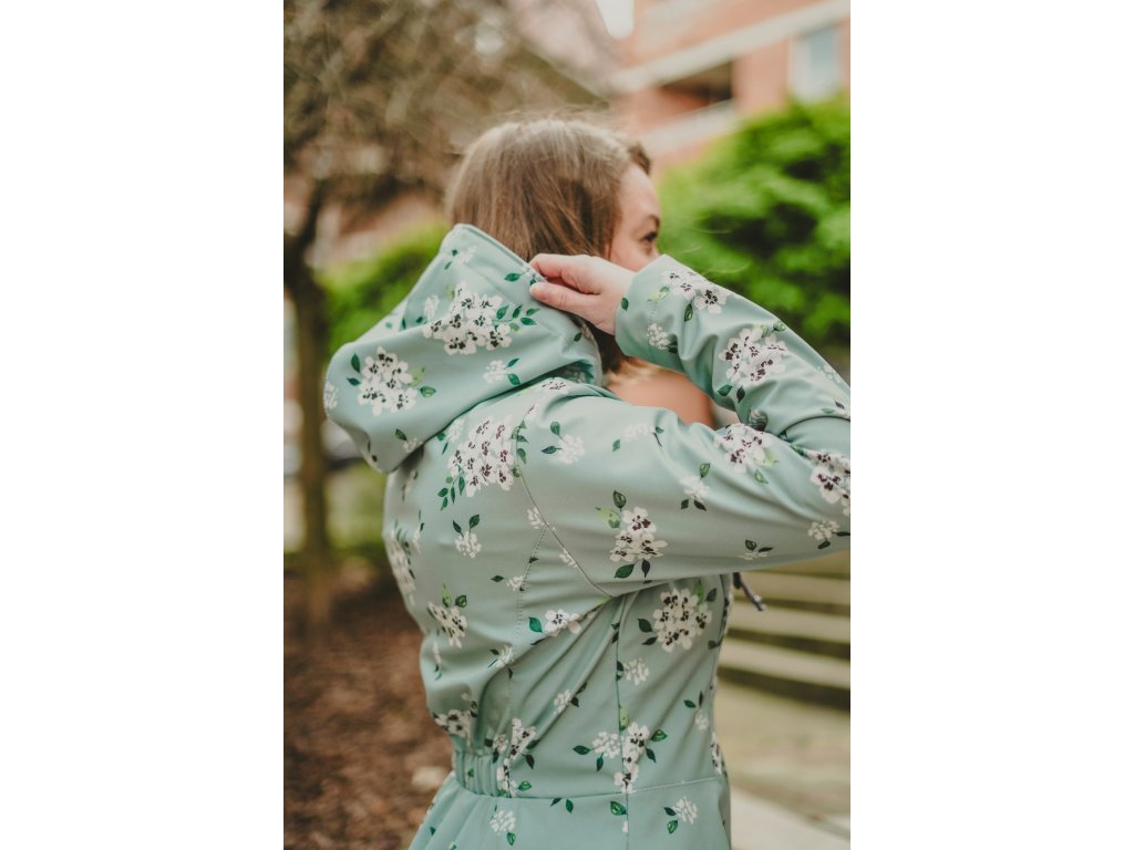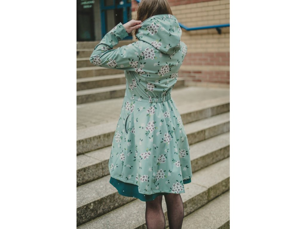 Dámský kabátek s půlkolovou sukní. Střih je projmutý do pasu, zadní díl je stažený do pevně všité gumy. Zádní délka je delší než přední část, spodek zadního dílu se lehce rozšiřuje a dolní lem je dokulata, na zadním díle je vyšité logo. V bočním švu jsou dvě kapsy - kapsový váček a kapsový průhmat je částečně ze softshellu a částečně z bavlněného úpletu (nebo plátna).