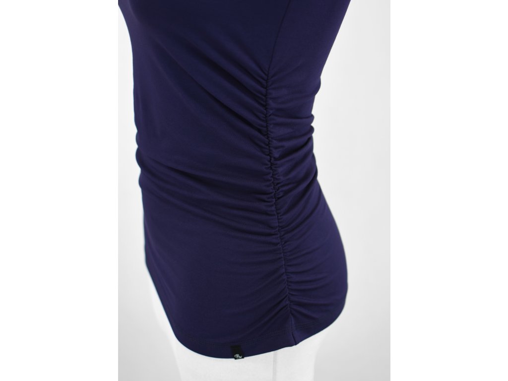 Dámské tričko s klínovými rukávy s vykrojenějším výstřihem do ramenou ne do hloubky. V bocích jsou řasené gumičkou z předního i zadního dílu, řasení je až dolů. Délka je lehce prodloužená a v pase je jen mírně projmuté. Bambus je velmi příjemný, antibakteriální, jemný a má i mírný lesk.